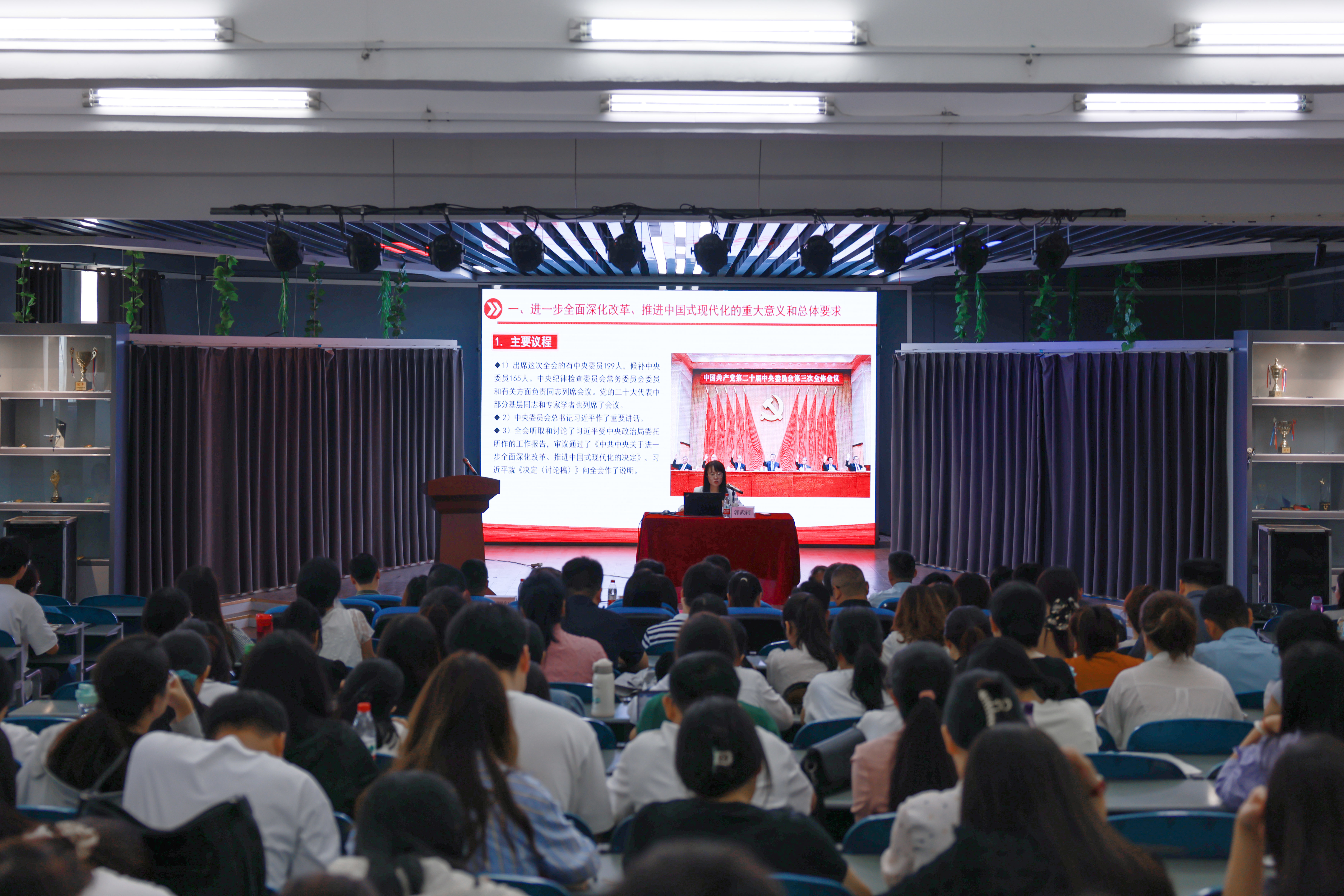 郭武轲以《进一步全面深化改革 为中国式现代化注入新动能》为题,从进一步全面深化改革、推进中国式现代化的重大意义和总体要求、中国式现代化道路的丰富内涵与意义,进一步全面深化改革的系统部署等三个方面进行系统阐释和深入解读。报告会结合历届三中全会以及党的二十届三中全会的概况,从历史、现实两个维度深入阐释了进一步全面深化改革的重要性和必要性,结合实际例子全面深入细致的解读了进一步全面深化改革、推进中国式现代化的重大意义和总体要求。本次报告会深刻解读了全会明确的“七个聚焦”的改革目标、“六个坚持”的重大原则、“十五个方面”的重要部署,精彩生动,思想性、指导性、操作性强,不仅是一次深刻的理论辅导,也是一堂生动的党课,为我校进一步深入学习贯彻党的二十届三中全会精神奠定了基础。