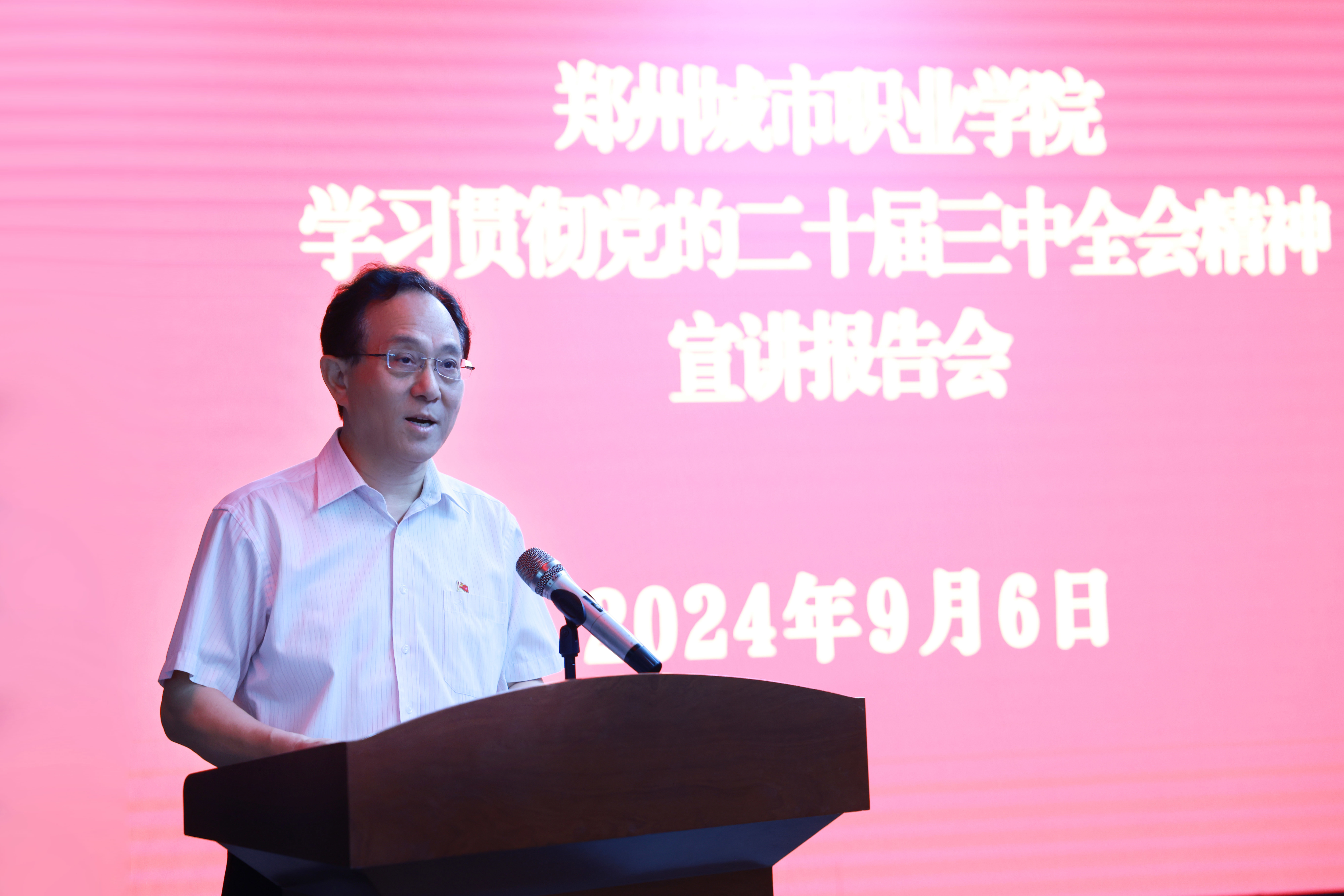 9月6日上午,郑州城市职业学院学习贯彻党的二十届三中全会精神宣讲报告会在1号楼503举行。会议邀请河南省青年理论宣讲专家、河南农业大学马克思主义学院教师郭武轲作专题报告。学校理事长赵帅,党委书记刘昆岭,校长徐洪波,党委副书记刘程,副校长石本立、谢照红、丁雅荣,校长助理段龙飞以及全体共产党员参加会议。报告会由刘昆岭主持。