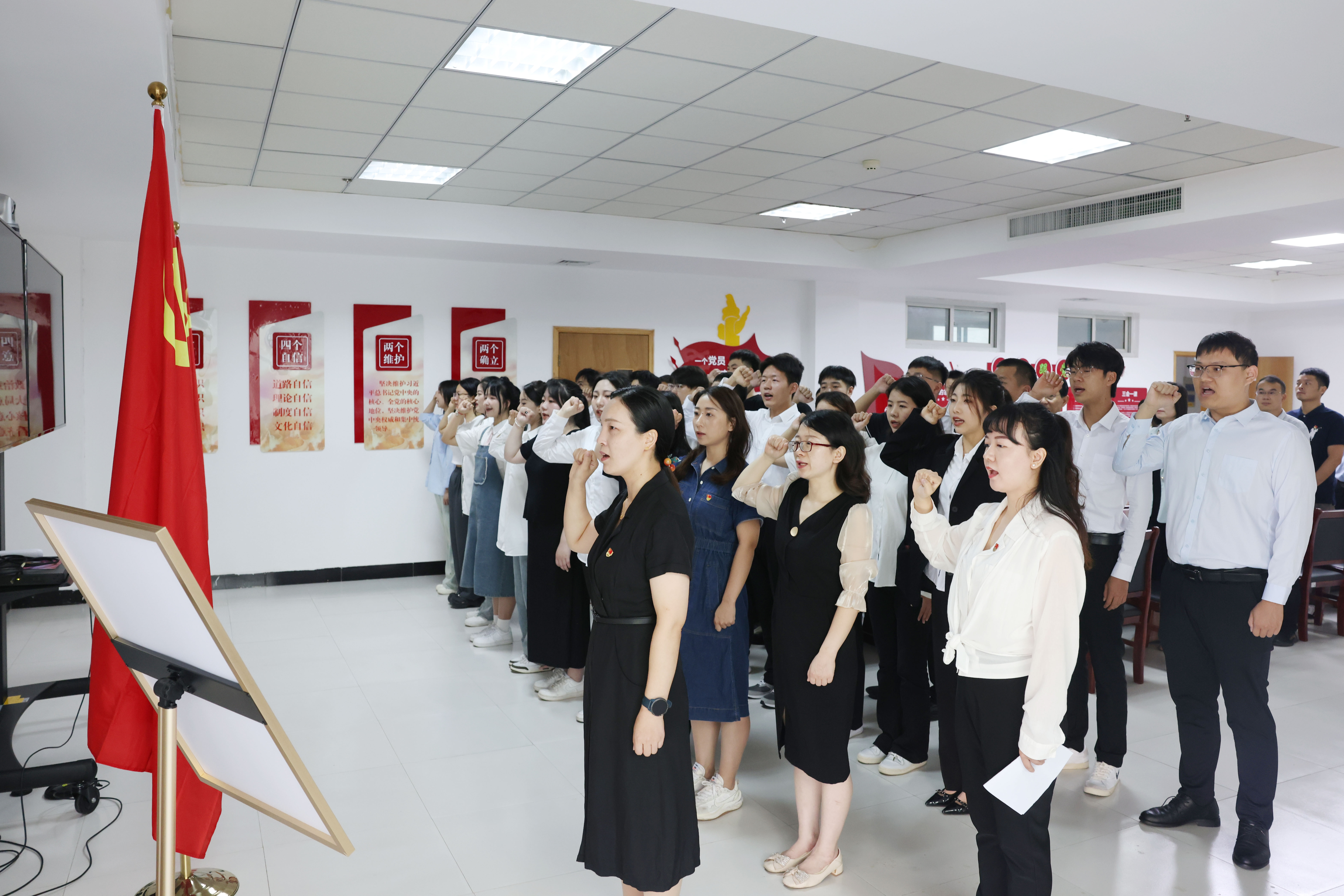 宣誓仪式在庄严的《国歌》声中拉开序幕。党委委员、宣传部部长陈瑞芳带领全体新党员面向党旗庄严宣誓:“我志愿加入中国共产党,拥护党的纲领,遵守党的章程……”铮铮誓言,表达了对党的无限忠诚和为党的事业奋斗终身的坚定信念。