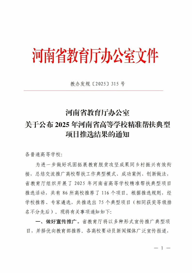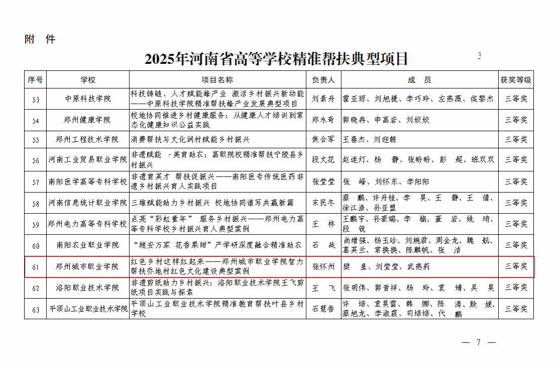近日,河南省教育厅公布2025年高等学校精准帮扶典型项目推选结果,郑州城市职业学院申报的《红色乡村这样红起来——郑州城市职业学院智力帮扶乔地村红色文化建设典型案例》在全省高校推荐的项目中脱颖而出,荣获三等奖,为学校在巩固拓展教育脱贫攻坚成果与乡村振兴有效衔接工作中再添亮眼成绩。