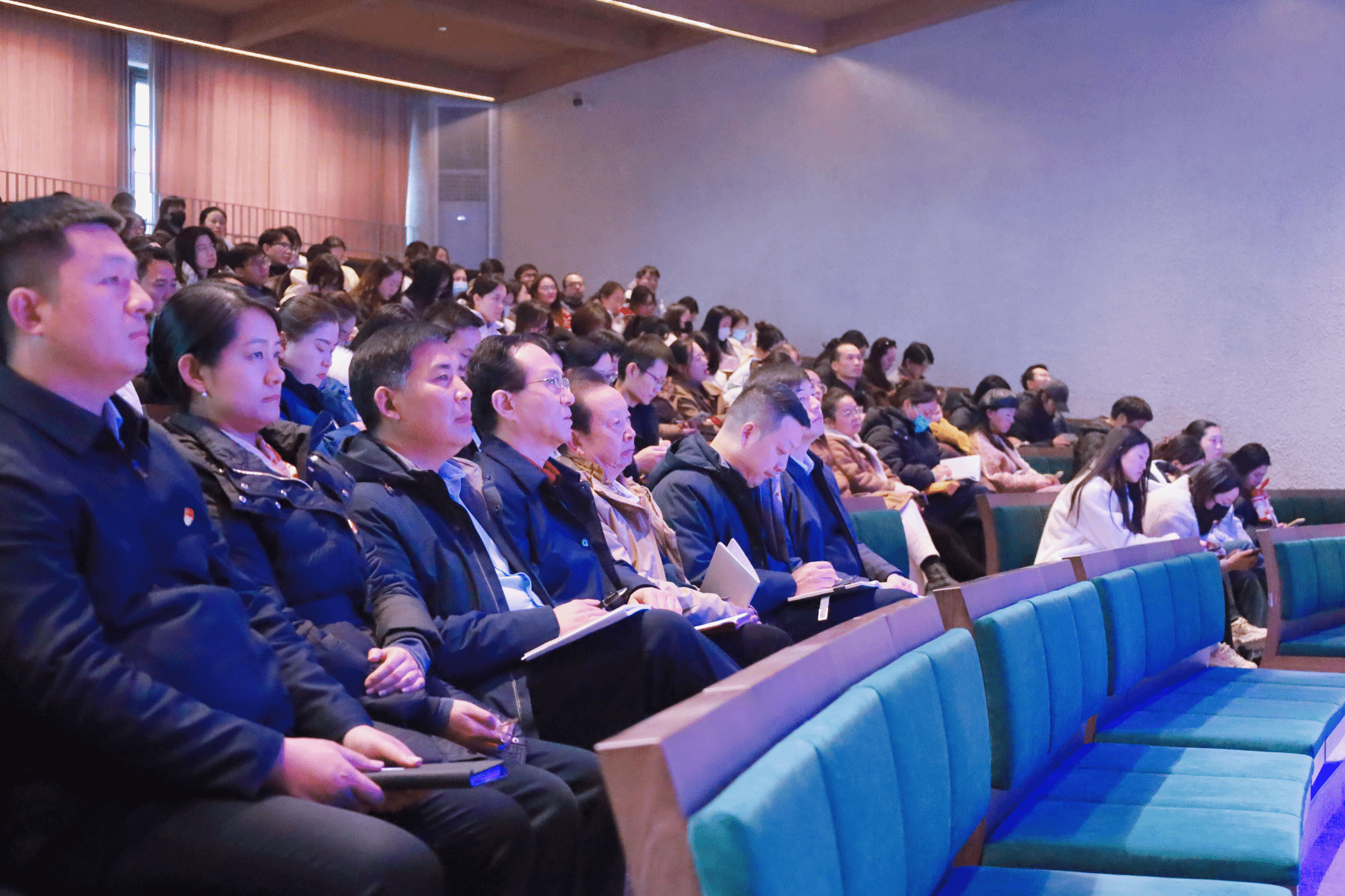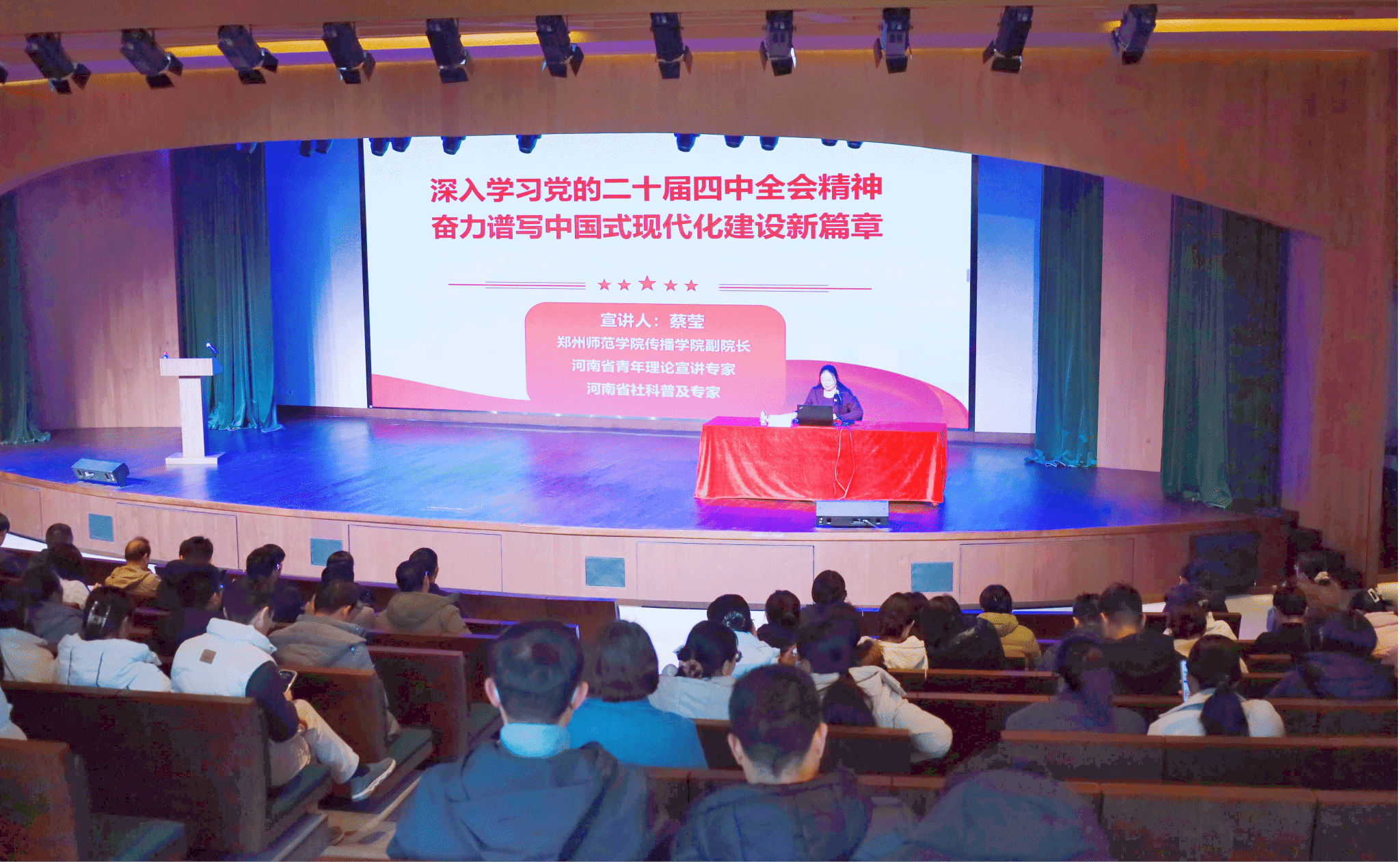 12月17日下午,我校全体教职员工在报告厅二楼集体学习党的二十届四中全会精神。会议邀请河南省青年理论宣讲专家、郑州市委宣讲团成员、郑州师范学院传播学院副院长蔡莹博士作宣讲报告。学校领导和全体教职员工共同参加报告会,报告会由党委书记刘昆岭主持。