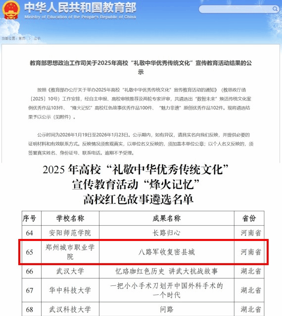 1月19日,教育部公布2025年高校“礼敬中华优秀传统文化”宣传教育活动评选结果,我校创作的红色云课堂视频作品《八路军收复密县城》成功入选。在河南省入选的18个作品中,民办高校仅2例,民办高职院校仅我校一例。这是我校思政成果继《李大钊在郑荥密调研》入选教育部全国高校思政课教师集体备课平台之后,再次获得的教育部殊荣。