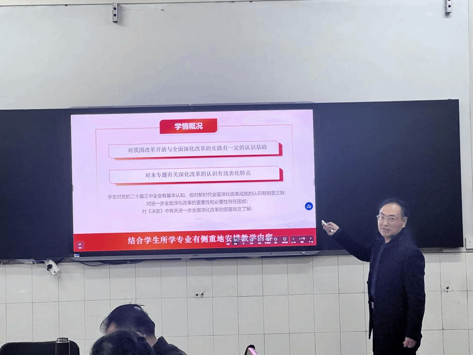 石振奇老师领学专题一《改革的实践续篇 现代化的时代新篇》,强调要讲清楚新时代全面深化改革取得的历史性伟大成就和进一步全面深化改革的目标任务、重大举措、根本保证;马兴府老师领学专题二《七十五载迎盛世 砥砺前行续华章》,强调要讲清楚新中国75年的辉煌成就,全面深化改革的历史性成就和中国特色社会主义道路的探索与实践;赵薇薇老师领学专题三《加快发展新质生产力》,强调要讲清楚发展新质生产力的重大意义以及新质生产力的特征;王文芳老师领学专题四《下好区域协调发展这盘棋》,强调要讲清楚区域协调发展的重大意义、战略部署、重点任务和成功案例;刘莹莹老师领学专题五《更好端牢能源的饭碗》,强调要讲清楚能源安全的重要性,我国能源发展的现状与挑战,端牢能源饭碗的路径与措施;陈厚兴老师领学专题六《坚定前行谋统一 续写民族新辉煌》,强调要讲清楚当前台海复杂严峻的形势及面临的挑战和坚定不移推进统一进程的根本遵循;张怀州老师领学专题七《推动构建新时代的大国关系格局》,强调要讲清楚大变局下国际格局调整的主要表现、大国的责任与担当以及中国的实践。通过教学要引导学生在正确认识党的重大决策,国家经济社会发展,祖国统一、民族复兴中展现青年担当。