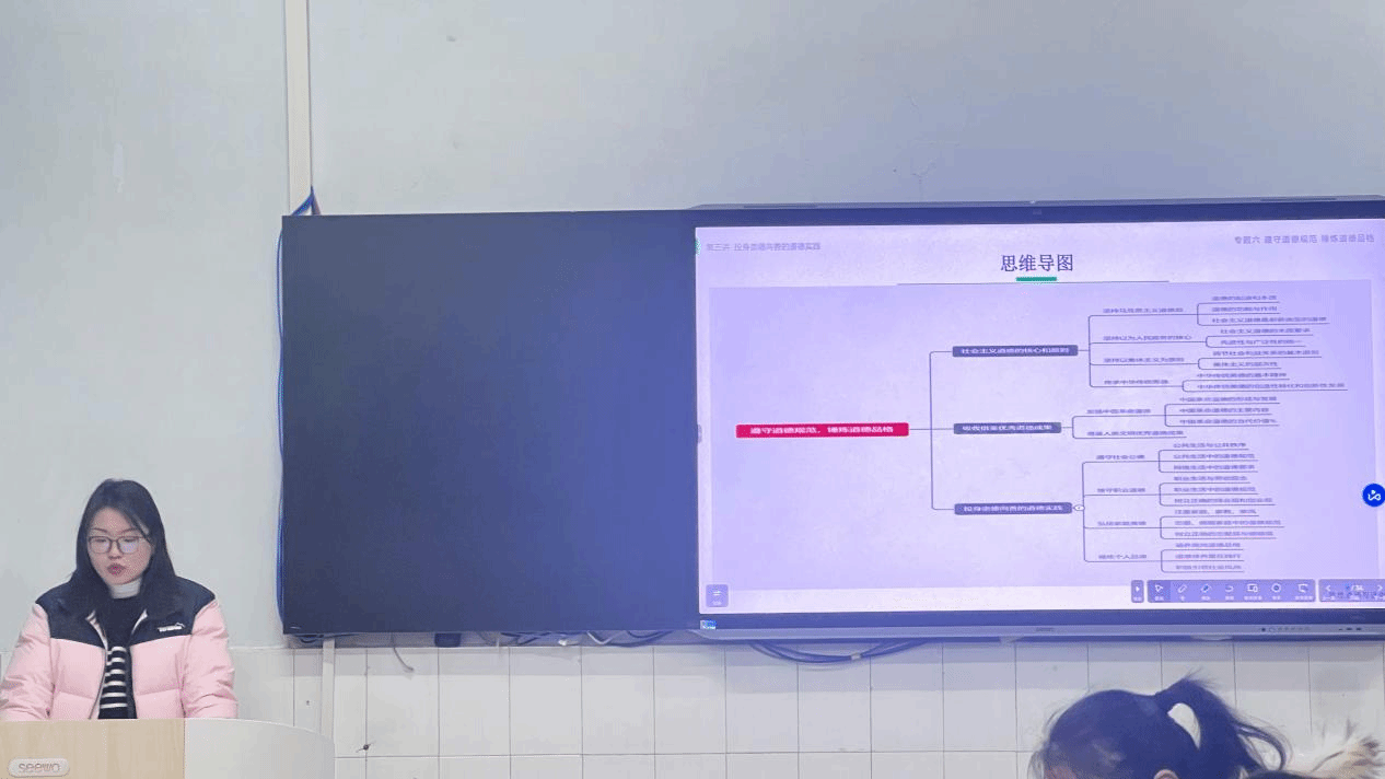活动首先进行的是“思想道德与法治”课程的集体备课。本次备课聚焦于教材第五章遵守道德规范 锤炼道德品格的内容,由刘莹莹老师领学。刘老师深入浅出地剖析了第五章的重点与难点,引导在座的教师们就教学方法、课程设计等议题展开了热烈讨论。