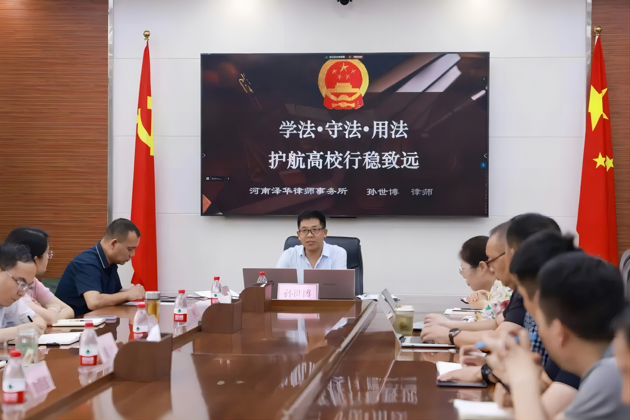 为进一步强化教职工的法律风险应对能力及合规意识,提升学校及教职工的法律风险防控能力,全面促进依法治校、依法治教、依法办学,7月10日,郑州城市职业学院特邀请河南泽华律师事务所孙世博律师作题为《学法守法用法,护航高校行稳致远》的法律知识培训。校领导、副处级及以上管理干部、学生处全体人员及辅导员参加会议。监事会主席、副校长武子文主持会议。