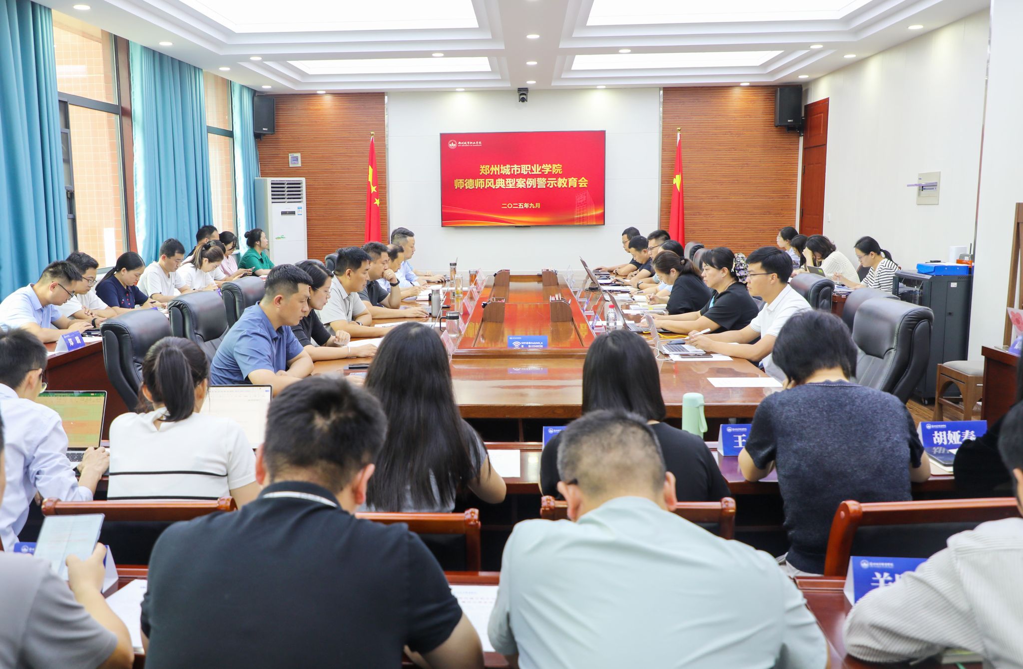 为进一步深化师德师风建设,引导全校干部职工恪守职业底线、规范从教行为,营造风清气正的育人环境,9月16日,郑州城市职业学院组织召开师德师风典型案例警示会,全体副处级及以上管理干部参会,监事会主席丁雅荣主持会议。