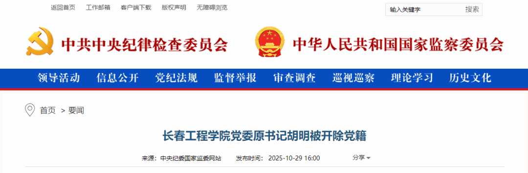 中央纪委国家监委网站10月29日通报,据吉林省纪委监委消息:日前,经吉林省委批准,吉林省纪委监委对长春工程学院党委原书记胡明严重违纪违法问题进行了立案审查调查。