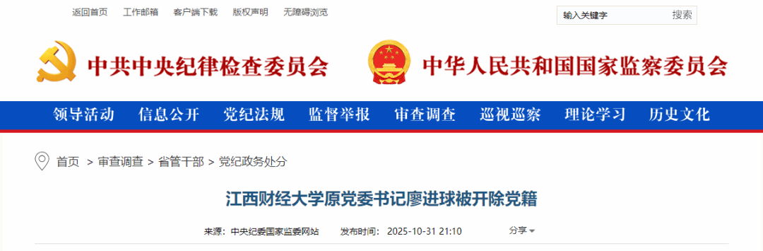 中央纪委国家监委网站10月31日通报,据江西省纪委监委消息:经中共江西省委批准,江西省纪委监委对江西财经大学原党委书记廖进球严重违纪违法问题进行了立案审查调查。