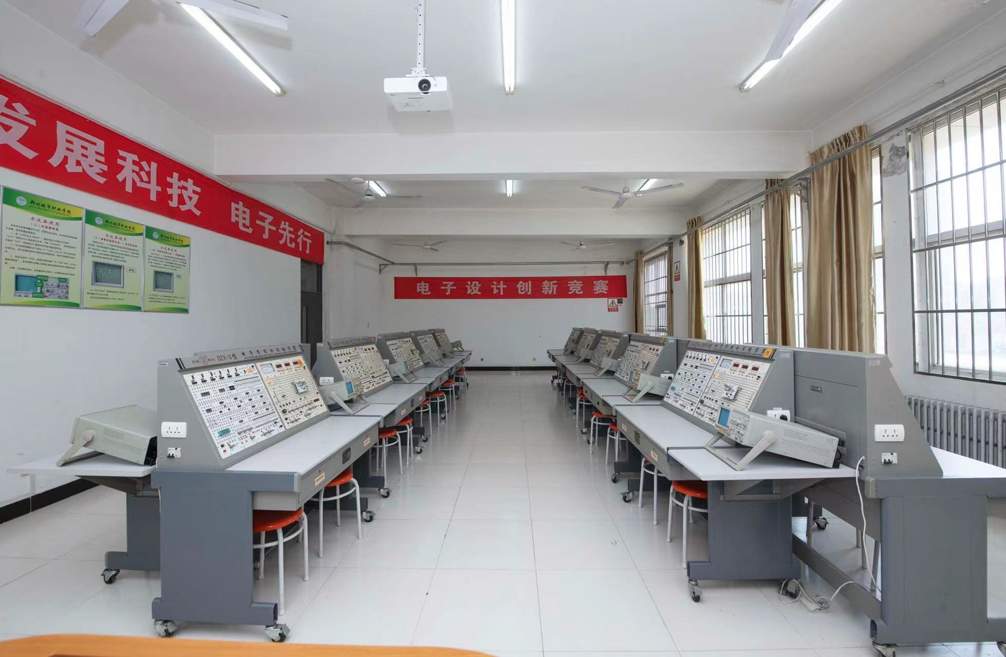 本实验室拥有电子教学实验装置20台、示波器20台、交流毫伏表20台、万用表20块。设备、仪器总资产达130000元,实验室总面积约104平方米。