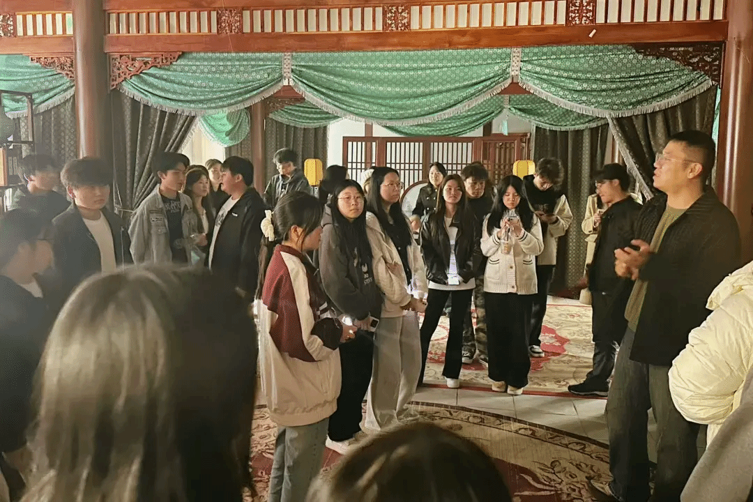 在基地专业人员的全程引导下,师生们逐一探访了古朴的城楼、鲜活的街市等各类实景拍摄场地。从场景搭建的材质甄选、空间规划,到道具陈设的巧思布局,同学们近距离拆解影视美术制景的每一个核心环节,在实地观察与深度交流中,搭建起对影视工业美术制景环节的系统认知框架。