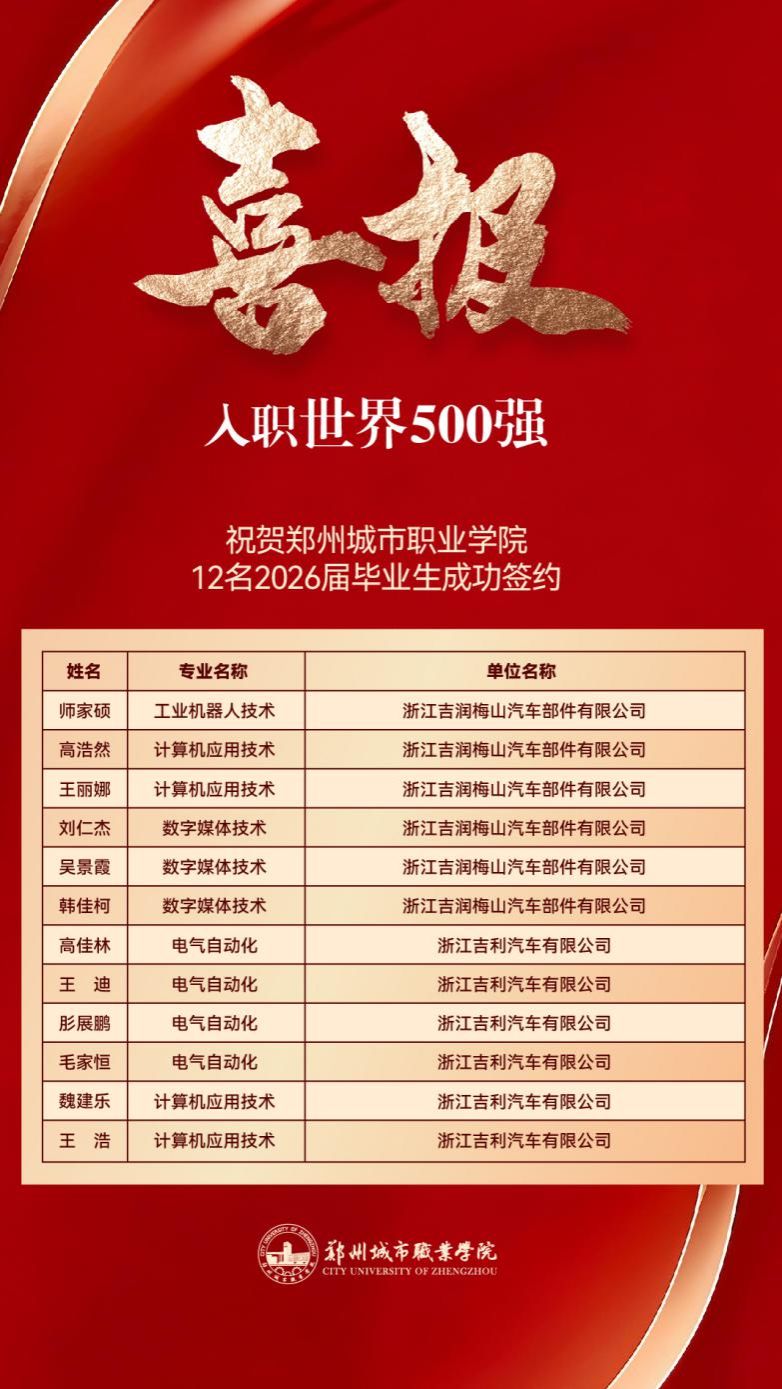 就业喜报 | 恭喜郑州城市职业学院12名2026届毕业生成功签约!