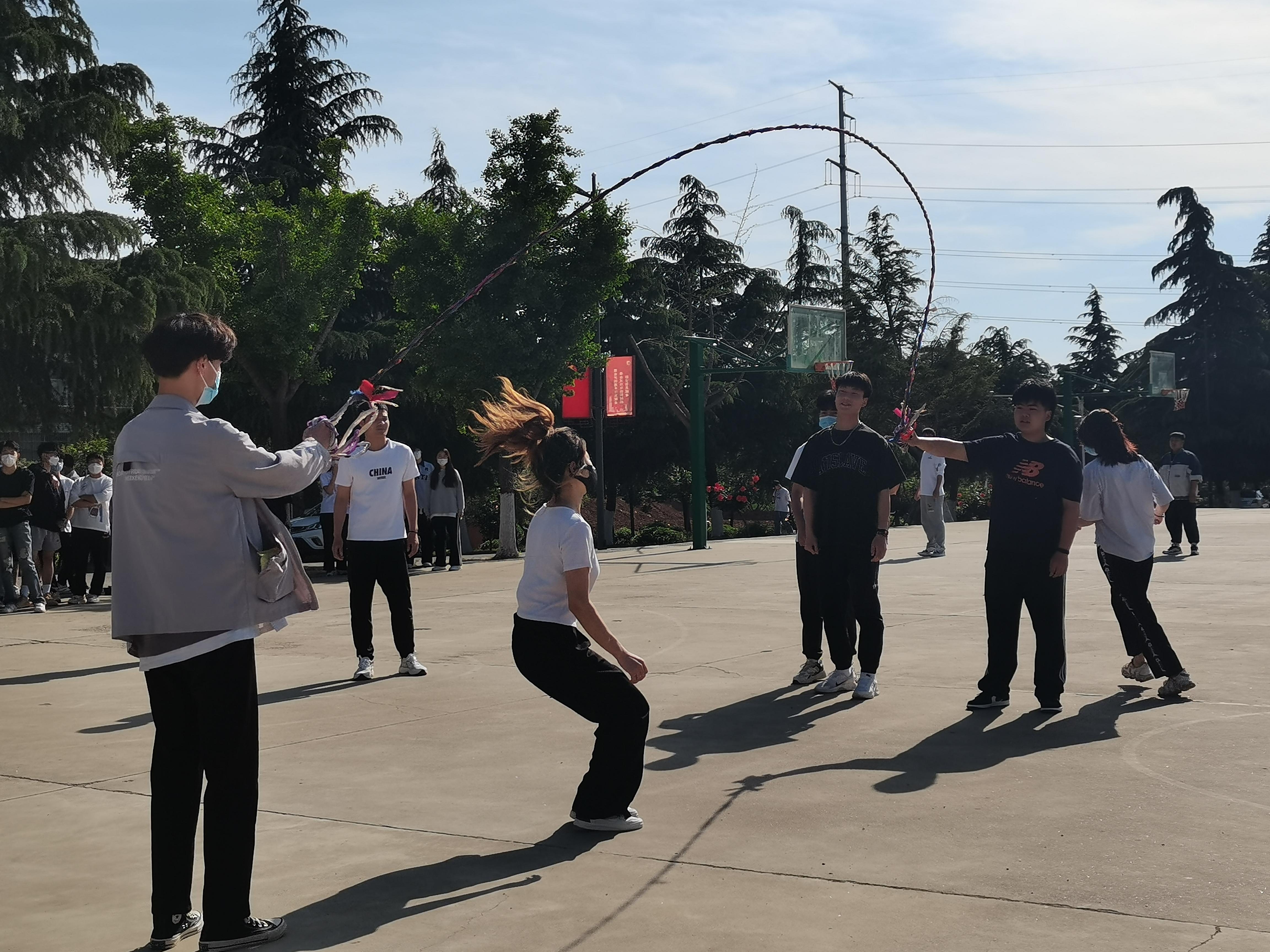 下午4:10比赛正式开始,在比赛中每个队伍都热情高涨,随着裁判员一声令下,绳子被同学们抡得呼呼生风,打得地面叭叭直响,同学们穿梭其间,身轻如燕,动作矫捷,全身心投入比赛。整个比赛过程掌声不断,笑声连连。