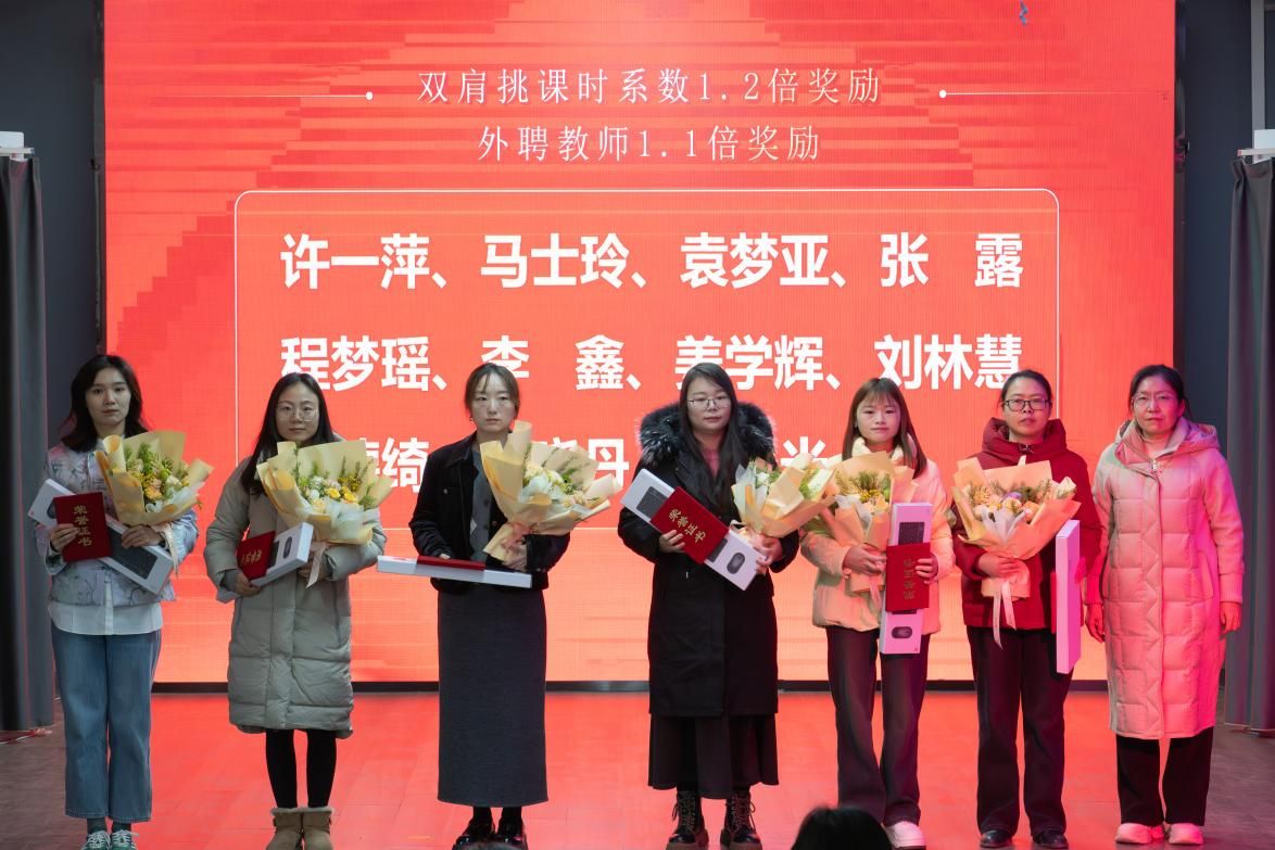 随后,主持人宣布了获奖教师名单并进行现场颁奖,质保中心副主任文灿为获得自有专任教师、双肩挑课时系数1.5倍奖励和外聘教师1.2倍课时系数教师颁奖。电子信息工程学院院长轩丹阳为获得自有专任课时系数1.2倍奖励教师颁奖。电子信息工程学院党总支书记马士玲、副院长刘伟丽为获得双肩挑课时系数1.2倍奖励和外聘教师1.1倍奖励教师颁奖。