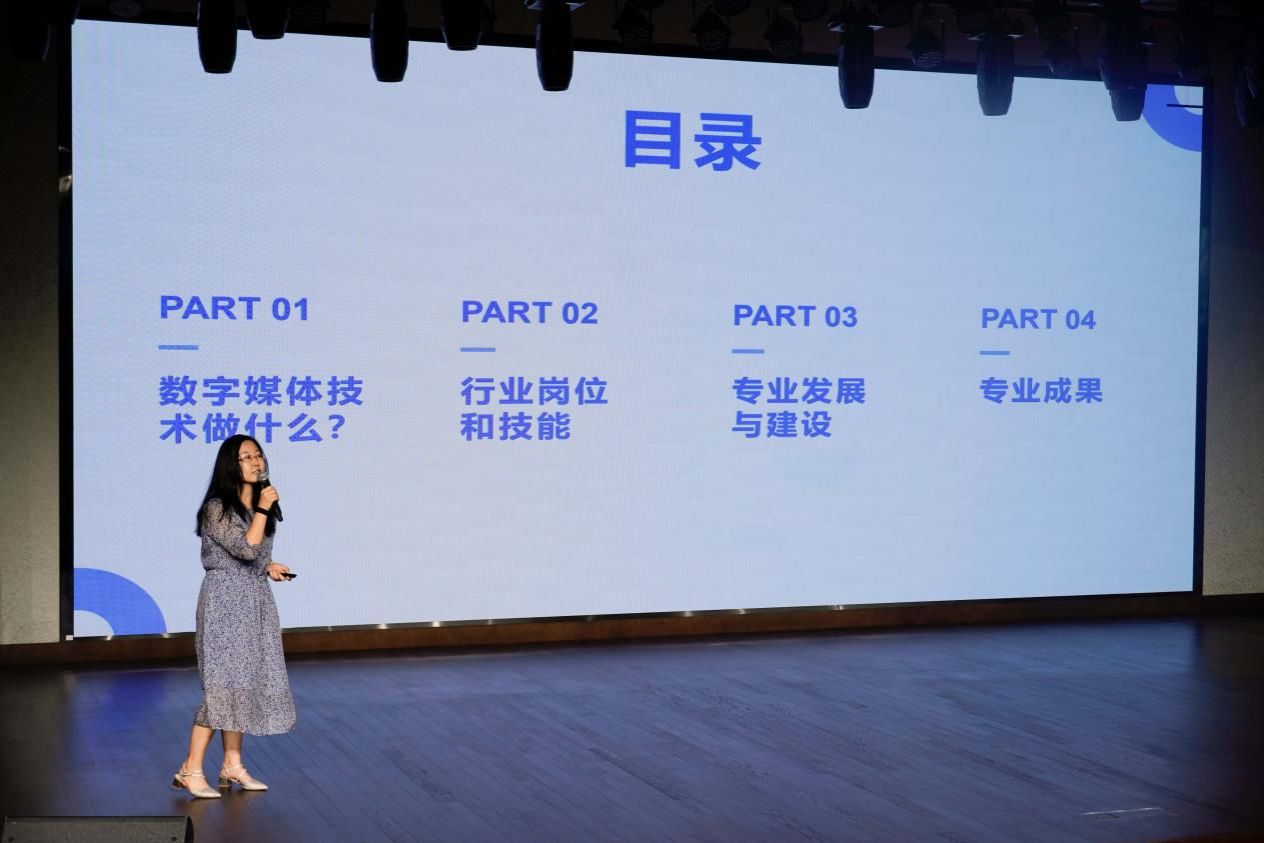 宣讲会分为三个环节。首先,专业负责人张雨老师系统阐述了数字媒体技术专业的培养目标、核心课程、专业技能、教学资源及就业方向等。她重点介绍了课程框架,让学生清晰认识课程模块知识体系从“认知层→技能层→实践层”的递进逻辑,直观呈现如何将理论知识转化为设计成果,特别强调专业的校企合作培养模式,构建了项目驱动、工作室协同的教学体系,为学生提供丰富多元的学习与实践平台。通过结构化呈现,帮助学生建立对专业的“全景认知”,从而更主动地规划学习路径。