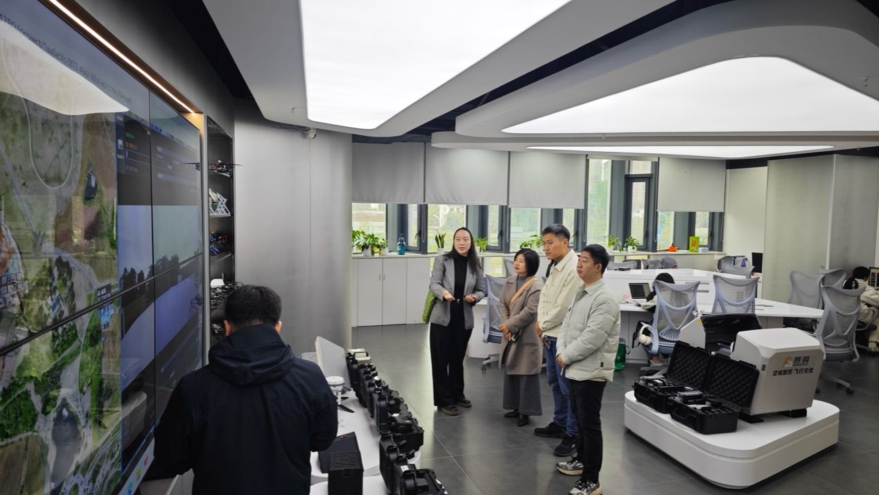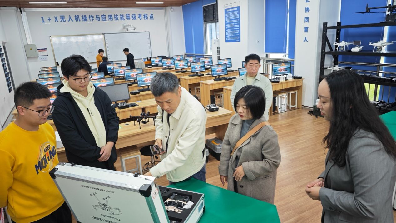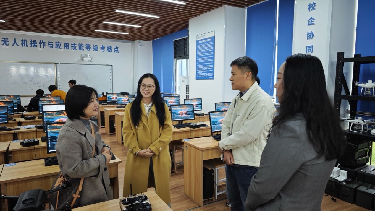 调研首站,团队走进四川邮电职业技术学院,重点参观无人机应用技术专业实训室。在该校无人机应用技术专业负责人陪同下,调研团队详细参观了无人机虚拟仿真实训室、装调检修实验室、行业应用实训区等功能区域,深入了解实训室的空间布局、设备配置标准、日常教学运行模式及安全管理规范。该校实训室“理论-实操-应用”一体化的建设思路,以及将大疆主流设备与虚拟仿真系统有机结合,既满足基础技能训练、又适配航拍、巡检、植保等行业场景教学的实践模式,为调研团队提供了宝贵的建设参考。