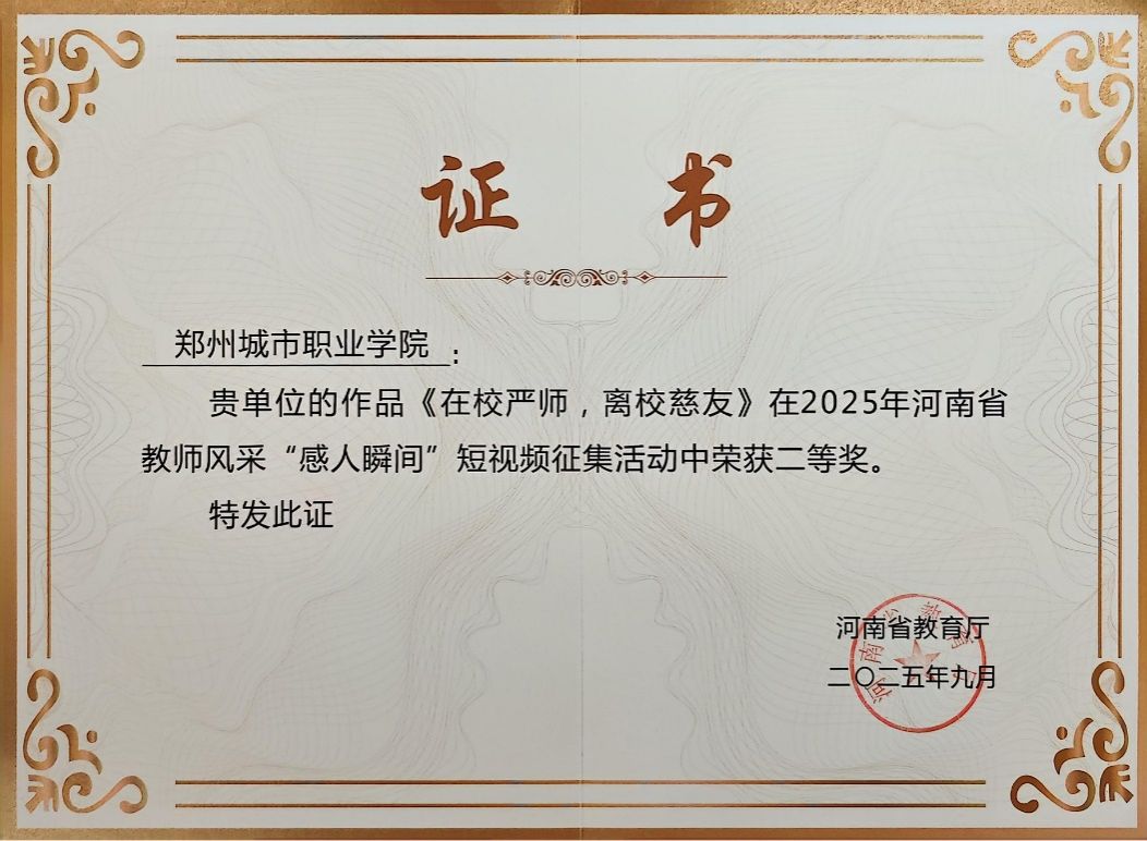 近日,河南省教育厅办公室正式公布了2025年教师风采“感人瞬间”短视频征集活动获奖名单。由郑州城市职业学院师生联合创作的作品《在校严师,离校慈友》脱颖而出,荣获省级二等奖,充分展现了学校师生优秀的创新实践能力与积极向上的精神风貌。