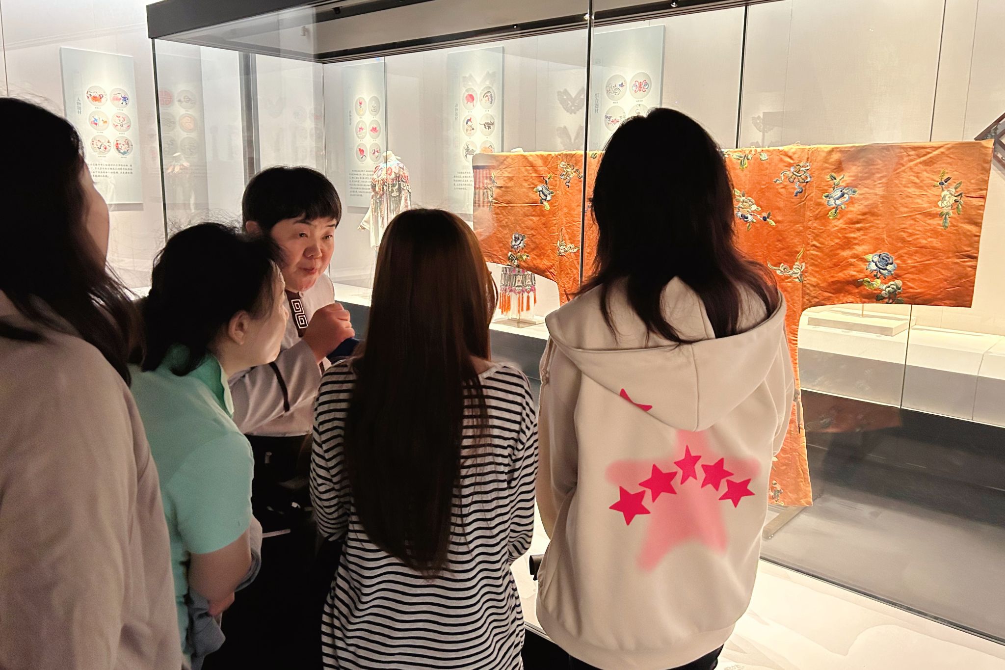 最让人印象深刻的莫过于《中原象踪》展厅!同学们零距离看到了大象化石、象牙化石,直观感受远古生物的神奇,配合生动的大象迁徙沙画,仿佛一秒穿越到远古,沉浸式解锁自然与生命的奥秘。《锦绣云霞》展厅的中式美学直接戳中学子们,古人的手艺也太绝了,精美的织物和纹样,让大家对传统服饰文化有了全新认知;《豫声豫调》展厅里,精致的豫剧演出服、鲜活的戏剧展示,让同学们真切感受到了河南豫剧的独特魅力,深深爱上了这份本土文化。