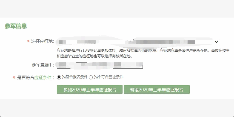 根据自己实际情况,选择应征地、参军意愿以及是否符合应征条件。