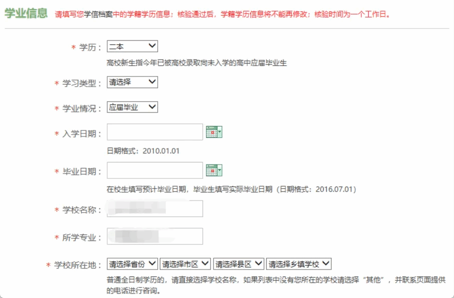 填写学信网学生档案中的学籍学历信息,如果对学籍信息有疑问,请登录学信网查看确认如果学业信息审核不通过,请咨询学校或武装部修改。核验通过后将不能更改,核验时间为一个工作日。
