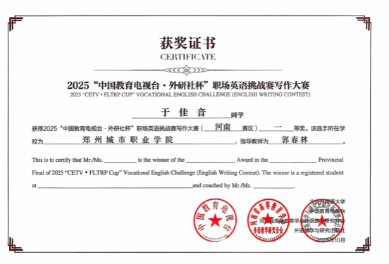 成果会闪耀:更令人振奋的是,于佳音同学凭借本学期练就的扎实功底,在2025年“中国教育电视台·外研社杯”职场英语挑战赛写作大赛中,荣获河南省一等奖。