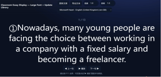 郭春林首先将地道的范文分解为独立的句子,以中英闪卡网页展示,配上AI朗读,这极大地降低了学生接触和理解文本的门槛。通过“逐句朗读→整篇背诵”的高频次练习,其目的并非机械记忆,而是让学生通过反复的口腔肌肉运动和声音刺激,将范文的优秀语料和篇章节奏,从“认知”层面沉淀为“肌肉记忆”和“语感”,真正在大脑中建立一个可随时调用的高质量“语料库”。