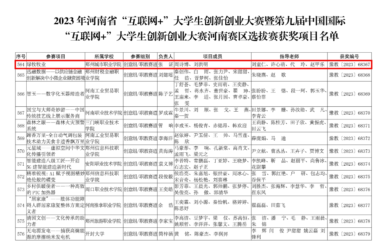 近日,由河南省教育厅等11个部门联合举办的2023年河南省“互联网+”大学生创新创业大赛暨第九届中国国际“互联网+”大学生创新创业大赛河南赛区选拔赛的获奖名单公布,郑州城市职业学院电子信息工程学院2022级计算机应用技术专业学生张证、周诗博、刘洪明的参赛项目《绿牧牧业》,荣获河南省三等奖。同时,郑州城市职业学院荣获“优秀组织奖”。