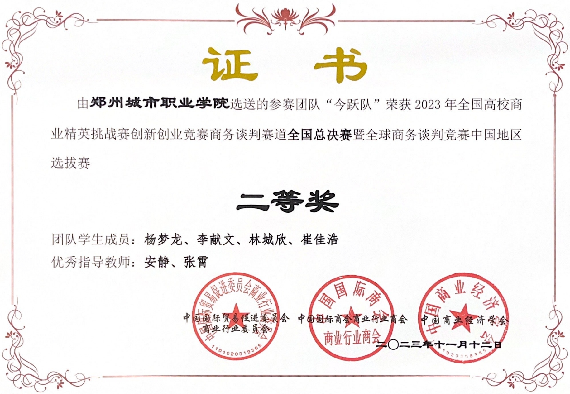 11月12日,由中国国际贸易促进委员会商业行业委员会、中国国际商会商业行业商会与中国商业经济学会联合主办的2023年全国高校商业精英挑战赛创新创业竞赛“商务谈判”赛道全国总决赛公布获奖结果。郑州城市职业学院商学院的杨梦龙、林城欣、李献文、崔佳浩四位同学组成的参赛团队荣获全国二等奖,指导老师安静、张霄荣获优秀指导教师称号。