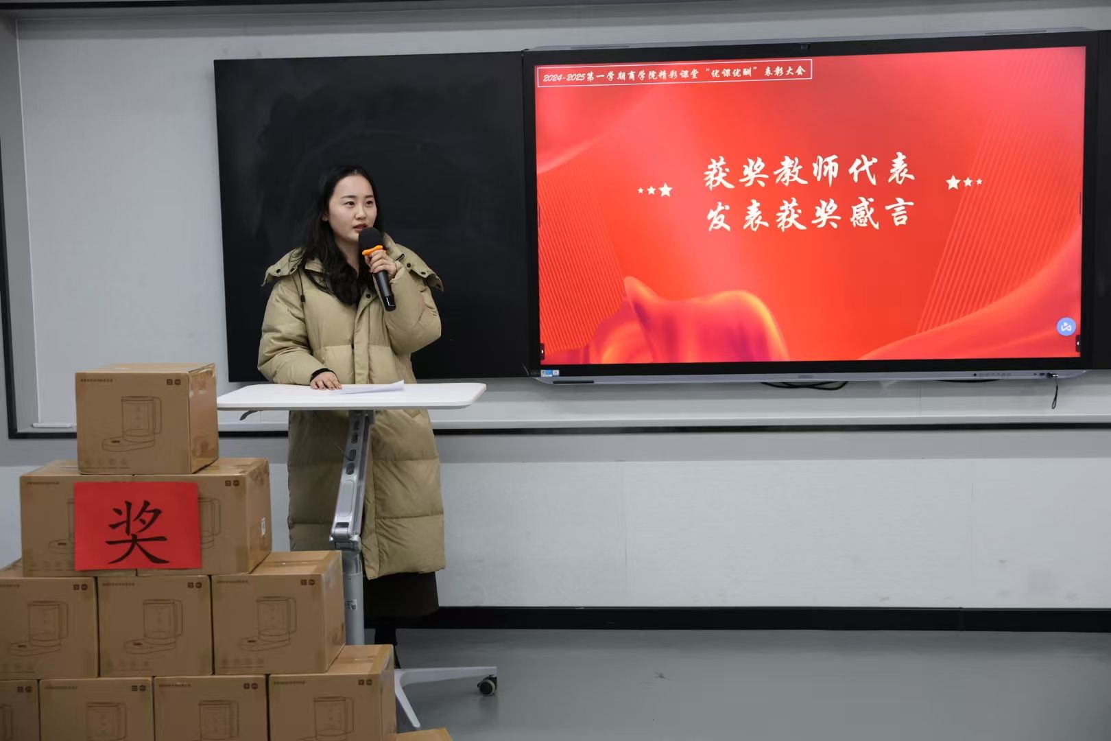 在教师代表发言环节,获奖教师黄晴宜分享了自己参加精彩课堂的感受。她表示非常感谢学校和学院以及学生们给予老师们的肯定与鼓励。在日常教学工作中,她始终将OBE理念应用于教学工作中,不断学习,勇于探索,努力提升自己的专业素养和教学能力。同时要始终坚持以学生为中心,用心去倾听学生的声音,想学生所想,用爱去引导他们成长。