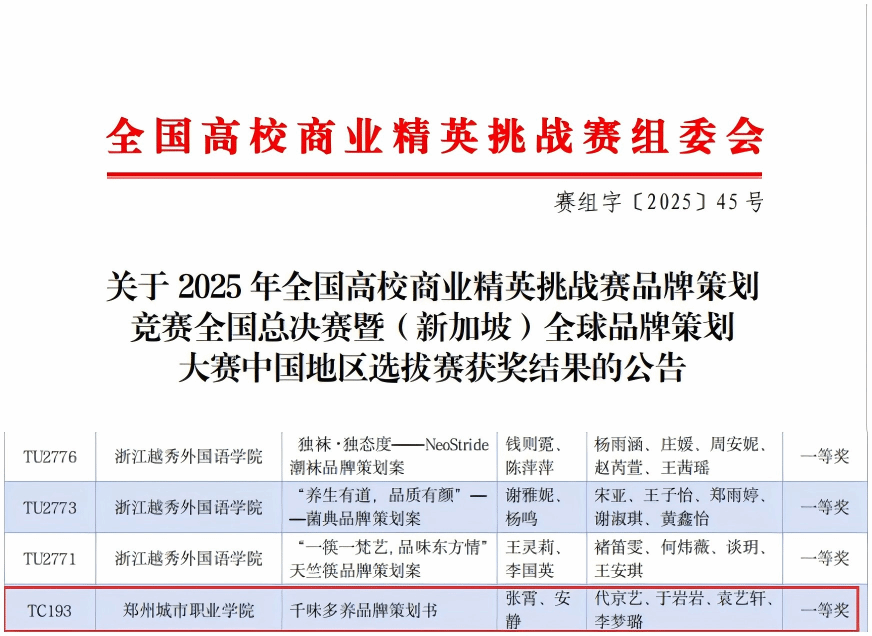 近日,2025年全国高校商业精英挑战赛品牌策划竞赛暨(新加坡)全球品牌策划大赛全国总决赛落下帷幕,全国高校商业精英挑战赛品牌策划竞赛是国家级A类赛事活动。本届竞赛共有来自全国各地的30个省、自治区、直辖市的600余所高等院校的7000余支参赛队报名参赛,其中“双一流”“211”“985”院校近100所。经过专家评审,最终共有3000多支团队入围并参加全国总决赛。本届大赛通过校赛、全国预选赛、全国总决赛层层选拔,我校由张霄、安静两位指导老师精心指导,代京艺、于岩岩、袁艺轩、李梦璐四位同学组成的团队脱颖而出,荣获全国一等奖。