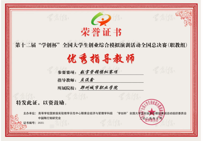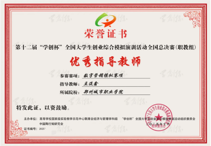 荣誉加身:更是凭借扎实的教学功底与创新能力,荣获“学创杯”创新创业教学能力大赛一等奖、“学创杯”跨境电子商务教师组一等奖等殊荣。