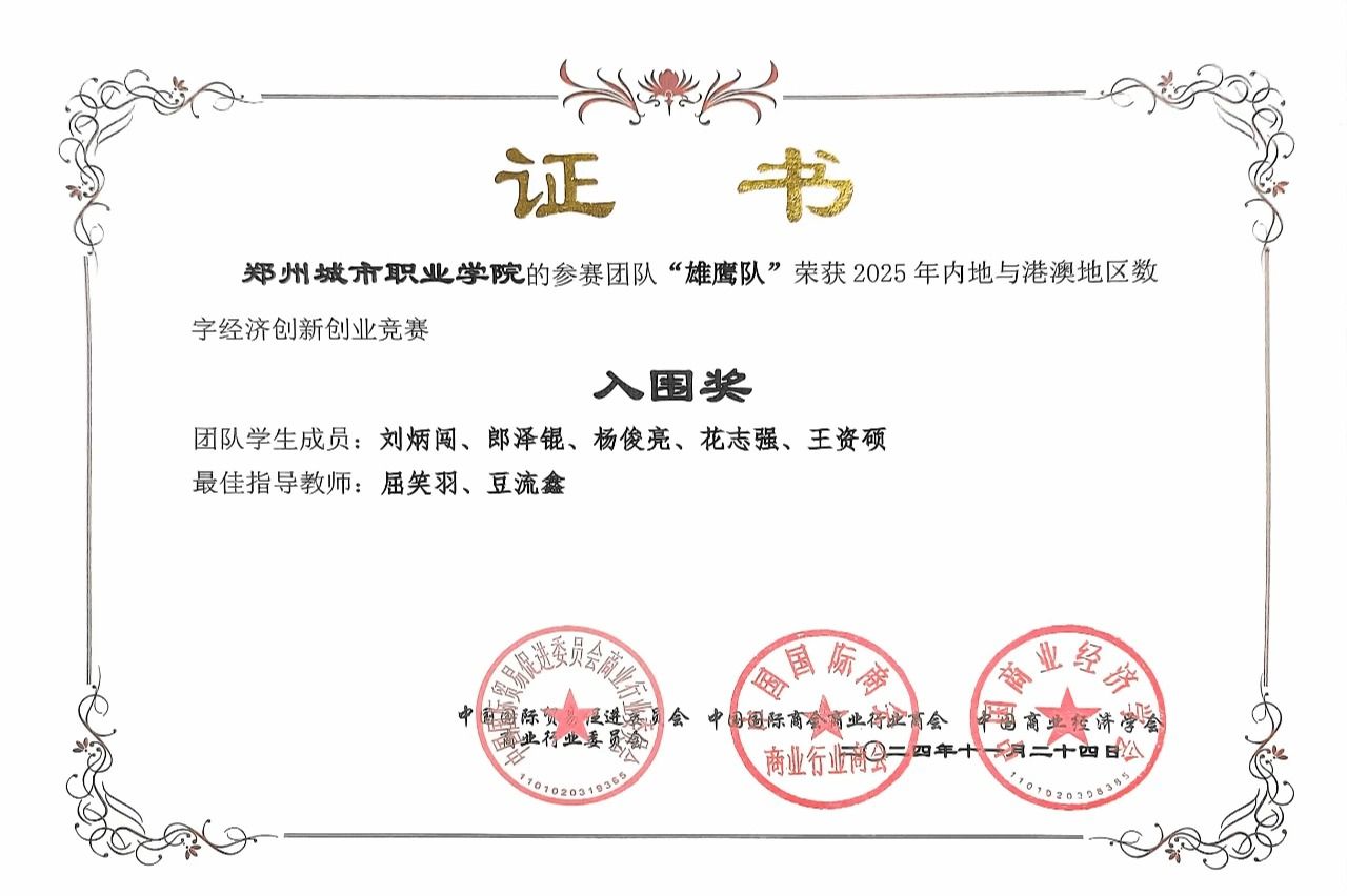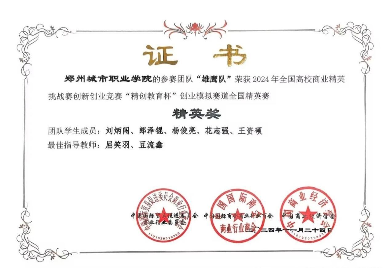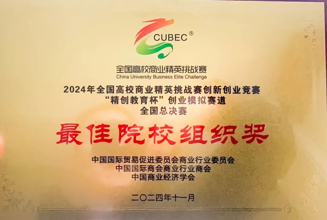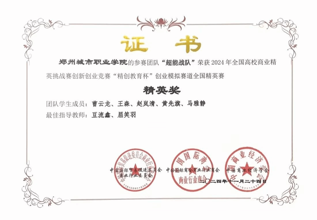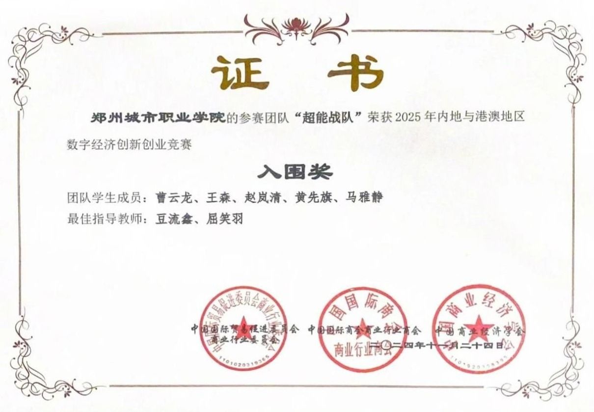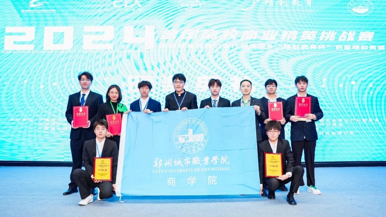 近日,由中国贸促会商业行业委员会、中国国际商会商业行业商会、中国商业经济学会主办的2024年全国高校商业精英挑战赛创新创业竞赛“精创教育杯”创业模拟赛道全国总决赛落下帷幕。郑州城市职业学院商学院参赛的两支队伍和来自全国各地本科的参赛选手同台竞技,斩获全国一等奖2项、全国赛精英奖2项,全国总排名第4,成为唯一进入全国总排名前10强的专科院校,并成功入围2025年内地与港澳地区数字经济创新创业竞赛,同时学校荣获最佳院校组织奖。这是一次新的突破。