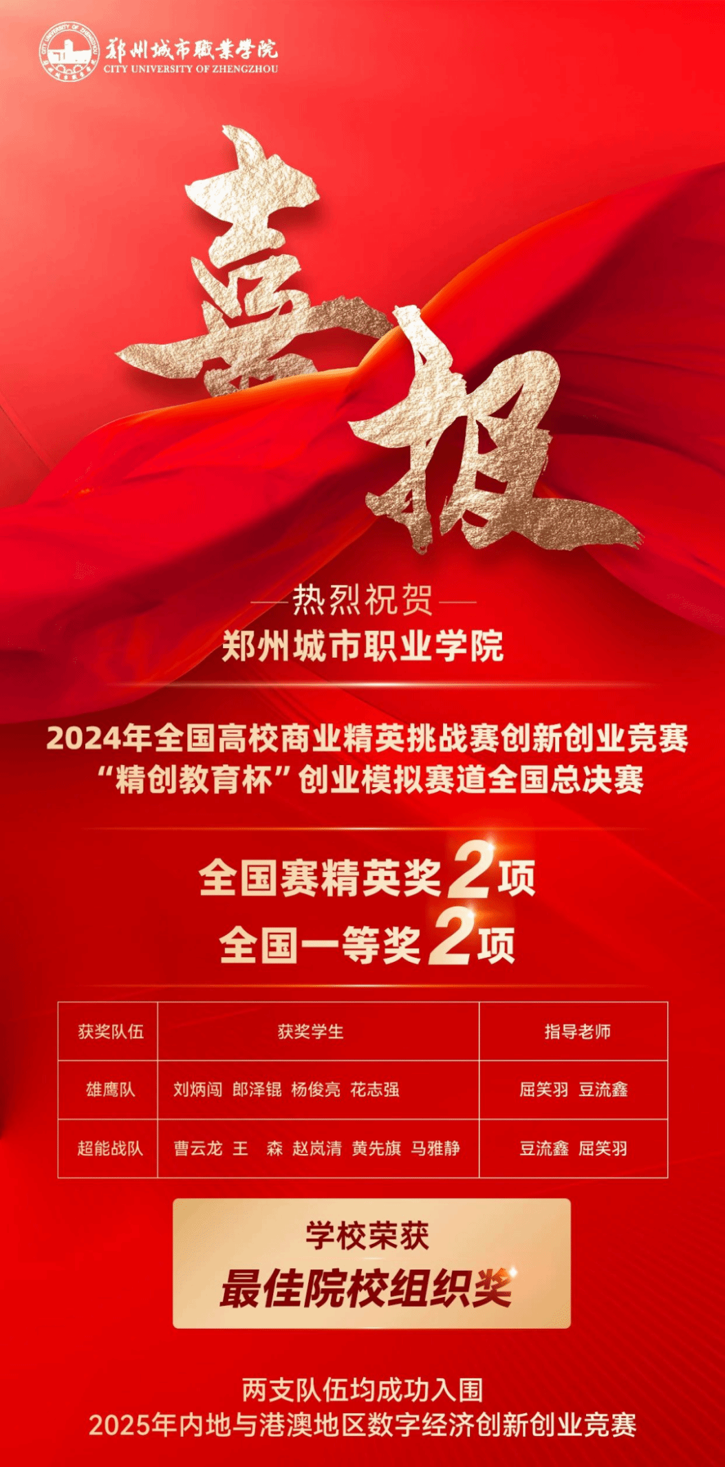 优秀!郑州城市职业学院学子再获全国一等奖+2!