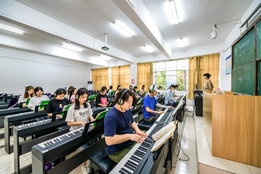 电钢琴实训室是钢琴技能课程的指定实训室,可同时容纳40名学生进行集体钢琴基础弹奏教学、器乐合奏教学、即兴伴奏训练等。通过教师演示讲解、学生独奏、合奏等形式,提高学生的钢琴演奏水平、即兴伴奏能力及合作意识。同时让学生们能够运用所学的钢琴技巧弹奏幼儿教育类教材中的儿歌,达到作为幼儿教师的钢琴基本要求,为将来更好地适应幼儿音乐教育打下坚的基础。