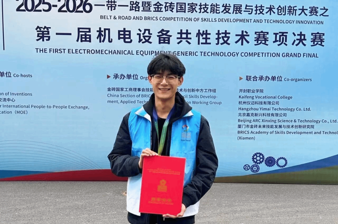 去年,刘铭威同学主动给申伟鹏老师打电话说:“申老师,您有空吗,接下来训练我不知道该练什么了,找不到方向了,您可以指导下吗?” 面对这么好学的铭威同学,申老师心里也是喜欢。“兴趣是最好的老师,铭威同学虽说高中是文科生,但他聪明活泼好动,对电气控制很感兴趣,他在大学找准了方向”,申老师说道,“我必须帮助他完成专业梦想。”接下来2025年的一带一路暨金砖国家技能大赛-电气自动化共性技术赛项,铭威同学不负众望,去年10月首次获得该赛项金牌,创造了学院学生竞赛历史。