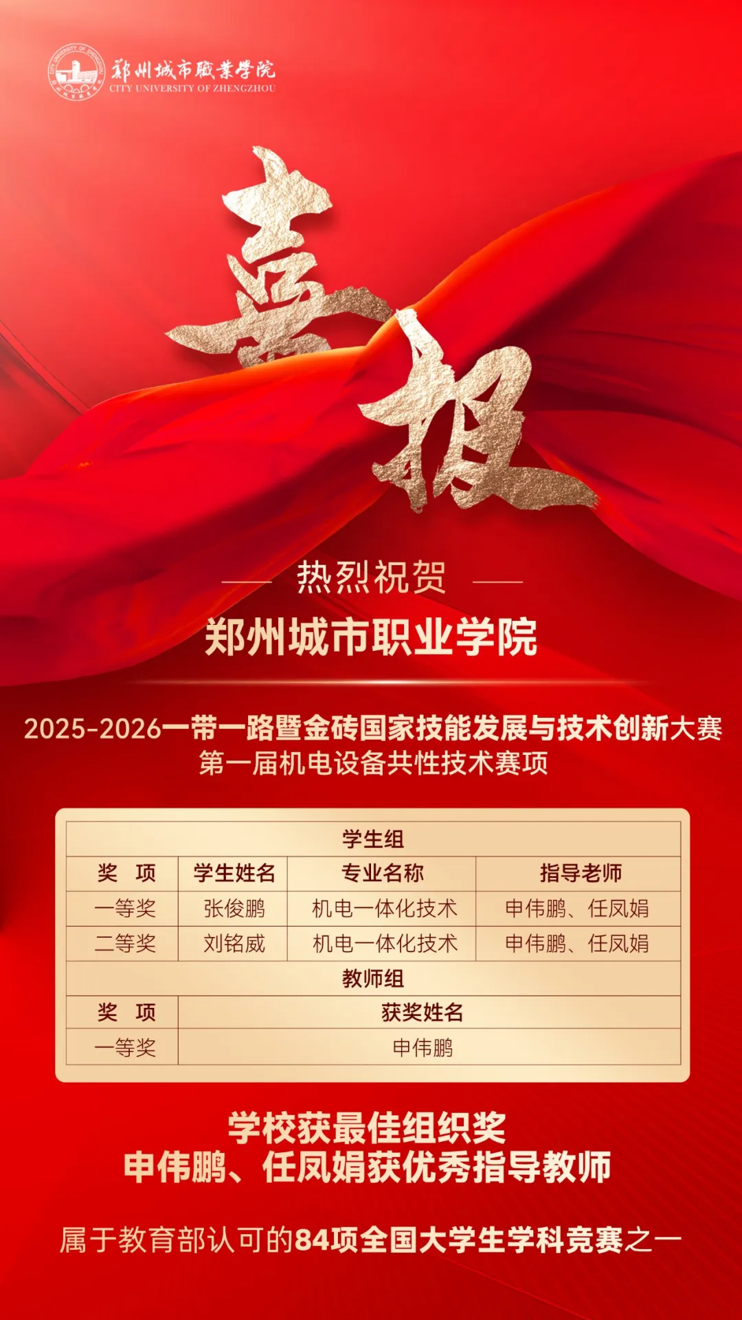 近日,一带一路暨金砖国家技能发展与技术创新大赛-机电设备共性技术赛项全国总决赛在河南开封圆满落幕。来自全国57所高校的142支师生代表队齐聚一堂,在机电设备共性技术领域激烈角逐竞技。郑州城市职业学院师生破围而出,斩获一等奖2项、二等奖1项,展示出扎实的技能水平和创新能力。