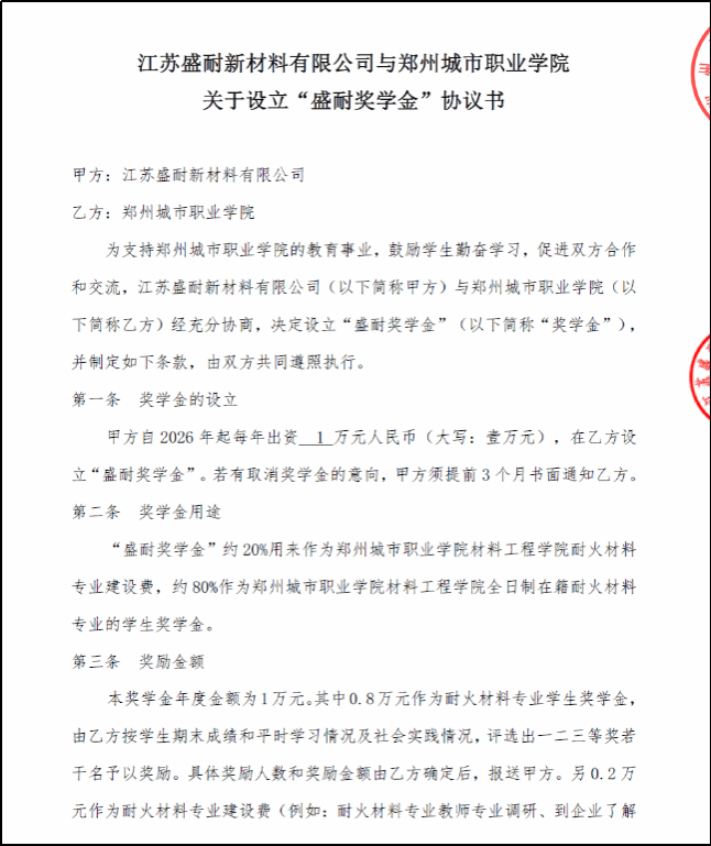 近日,江苏盛耐新材料有限公司与郑州城市职业学院正式签署合作协议,设立“盛耐奖学金”,用于支持郑州城市职业学院耐火材料专业建设发展及优秀学生培养。这一举措标志着双方在校企协同育人方面迈出坚实一步,为耐火材料行业高技能型人才的培养注入新动能。