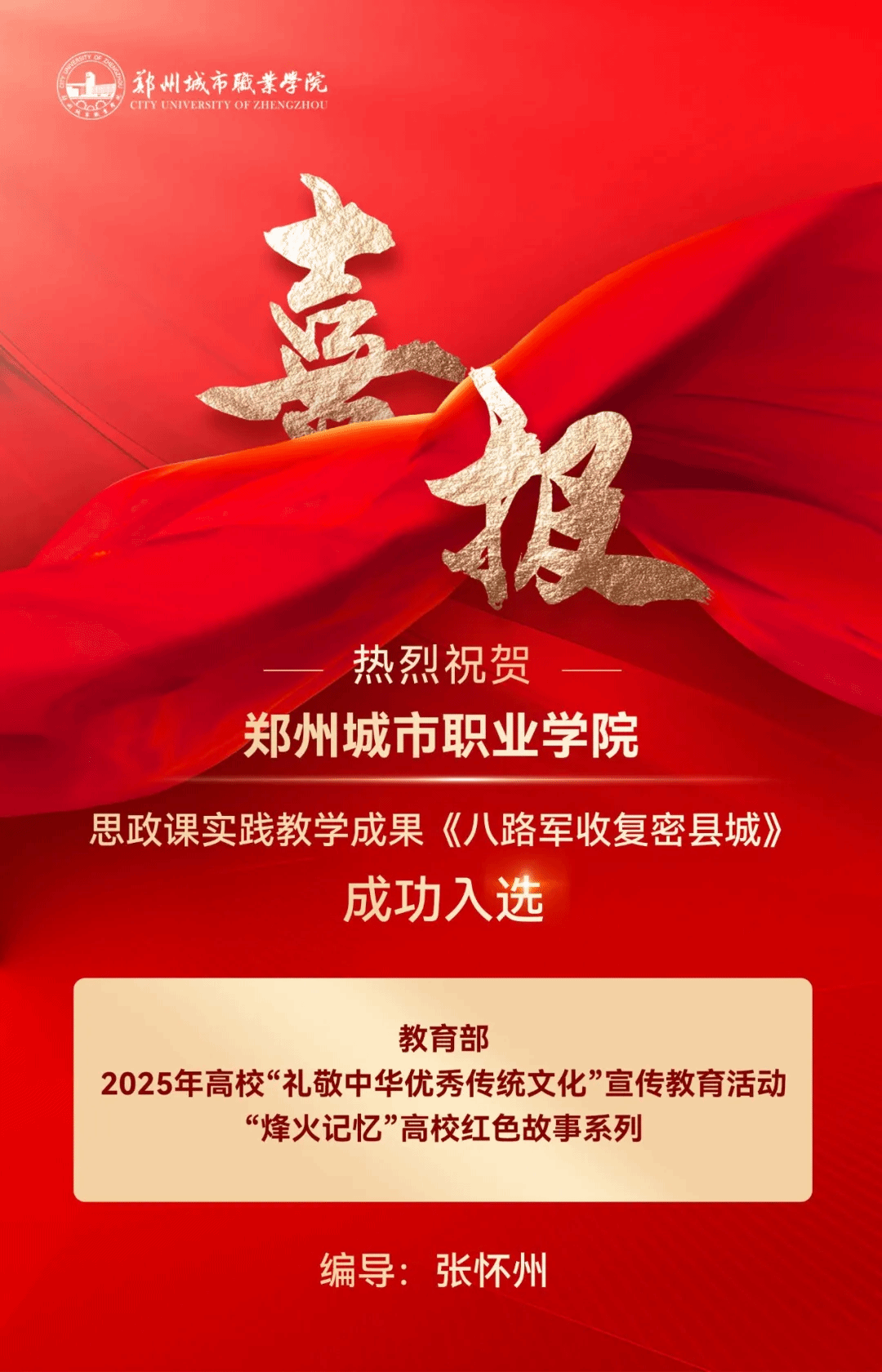 教育部公布2025年高校“礼敬中华优秀传统文化”宣传教育活动评选结果,郑州城市职业学院创作的红色云课堂视频作品《八路军收复密县城》成功入选。在河南省入选的18个作品中,民办高校仅2例,民办高职院校仅我校一例。这是我校思政成果继《李大钊在郑荥密调研》入选教育部全国高校思政课教师集体备课平台之后,再次获得的教育部殊荣。