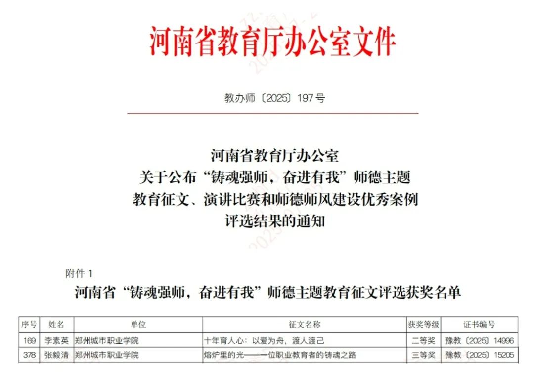 近日,中共河南省委教育工委、河南省教育厅公布了2025年“铸魂强师,奋进有我”师德主题教育征文活动评选结果。郑州城市职业学院教师斩获省级奖项2项,其中,学校电子信息工程学院李素英老师的作品《十年育人心:以爱为舟,渡人渡己》荣获二等奖;建筑工程学院张毅清老师的作品《熔炉里的光——一位职业教育者的铸魂之路》荣获三等奖。