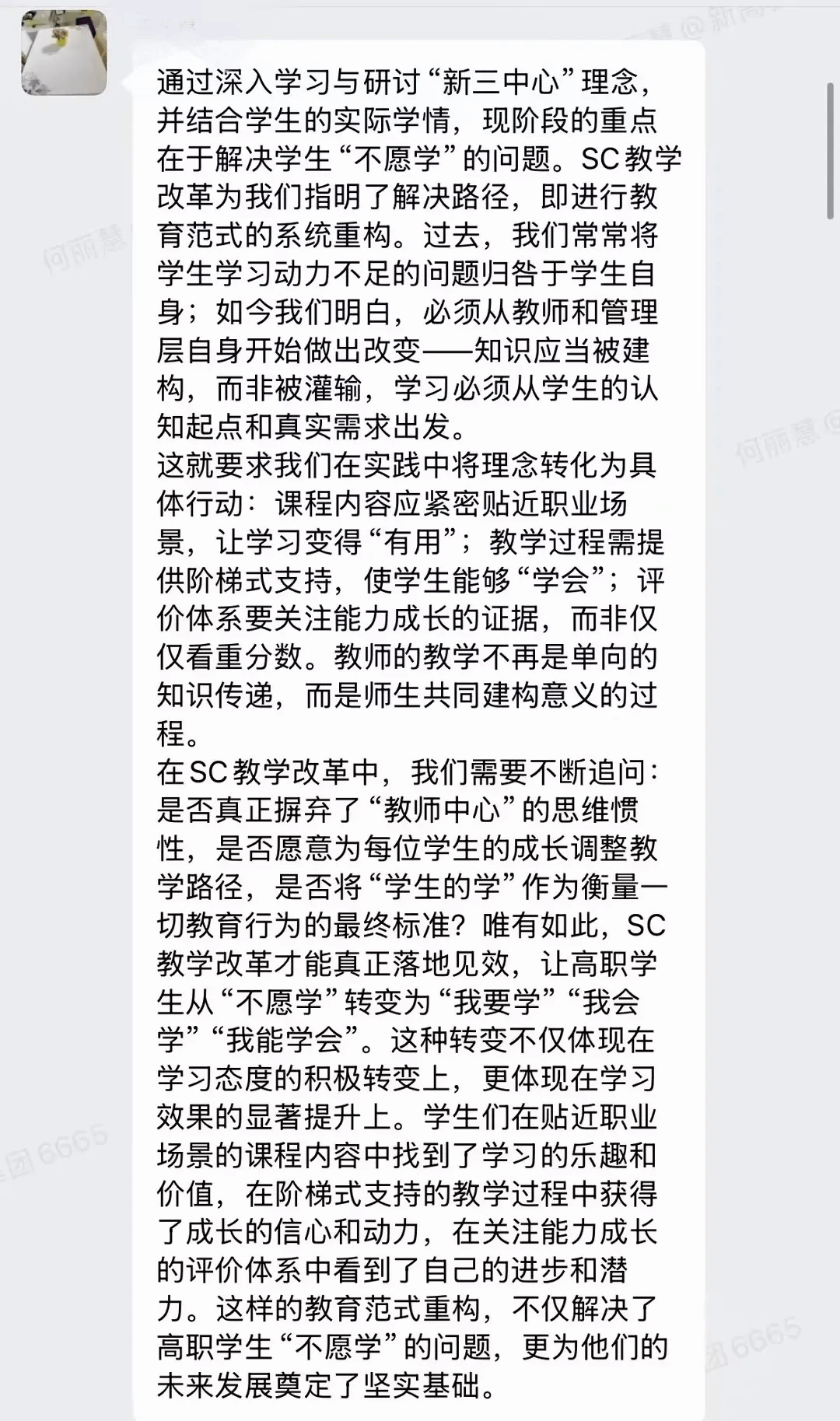 在总结环节,与会人员立足自身岗位,结合工作坊所学所悟,依次分享了心得体会与未来工作方向的转变思路。大家一致表示,将以“新三中心”理念为指引,将研讨共识切实转化为推动本职工作的具体行动,共同服务于学生成长与发展。本次工作坊凝聚了全校管理层的改革共识,明确了协同行动的路线,标志着郑州城市职业学院在教学改革与内涵发展上迈出坚实一步,为学校高质量发展注入新的思维动力与行动路径。