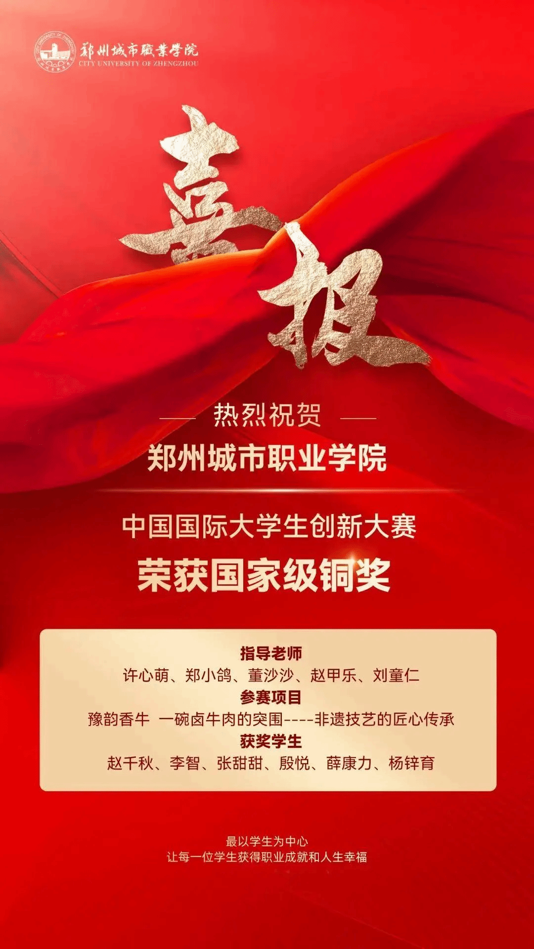 近日,教育部正式公布了中国国际大学生创新大赛(2025)获奖名单(教高函〔2026〕1号)。郑州城市职业学院“豫韵香牛”团队凭借《一碗卤牛肉的突围——非遗技艺的匠心传承》项目,历经校赛、省赛、国赛层层选拔与激烈角逐,成功斩获国赛铜奖,学校成为河南省同类院校唯一连续两年入围国赛院校。