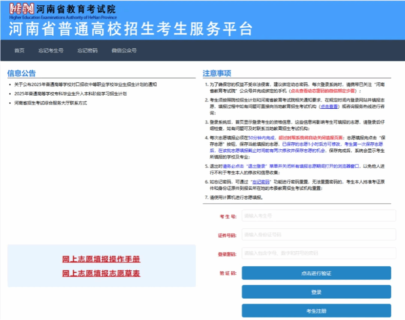 进入考生服务平台后,请仔细阅读“信息公告”区、“注意事项”区发布的政策公告和注意事项。