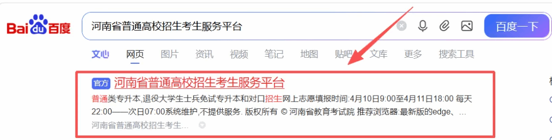 考生登录河南省普通高校招生考生服务平台(https://pzwb.haeea.cn/stu),或在搜索引擎中输入“河南省普通高校招生考生服务平台”,点击带有“官方”标识的网站。