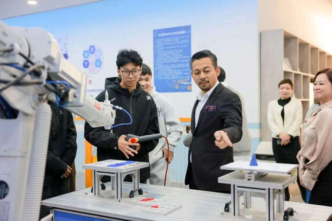 马来代表团一行先后参观工业机器人和电气自动化专业实训室、新能源汽车技术专业实训室、无人机培训基地、机电一体化技术专业实训室等教学实训场所。代表团对学校优美的育人环境、完善的实训设施、浓厚的学风氛围及务实的人才培养举措给予了高度评价。