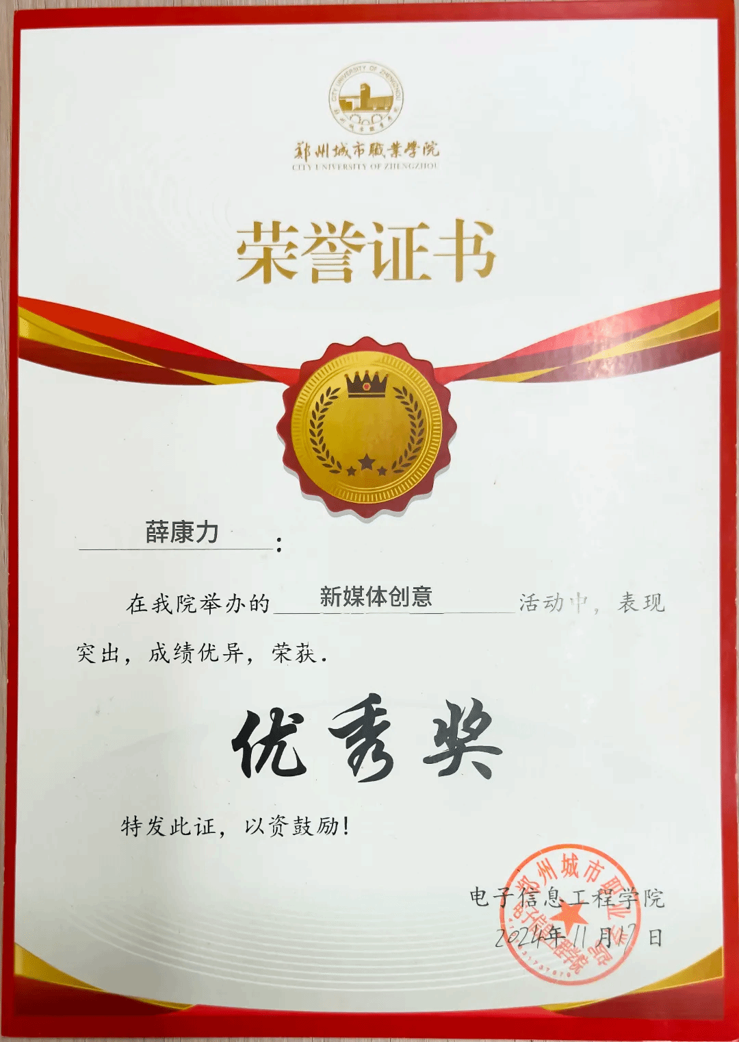 近日,第三届全国大学生职业规划大赛全国总决赛在天津圆满落幕。郑州城市职业学院2023级电子商务(新媒体营销)专业学生薛康力,凭借“守艺焕新——让非遗‘活’在指尖,让文化‘火’在云端”项目斩获国家级金奖,学校获高校优秀组织奖。