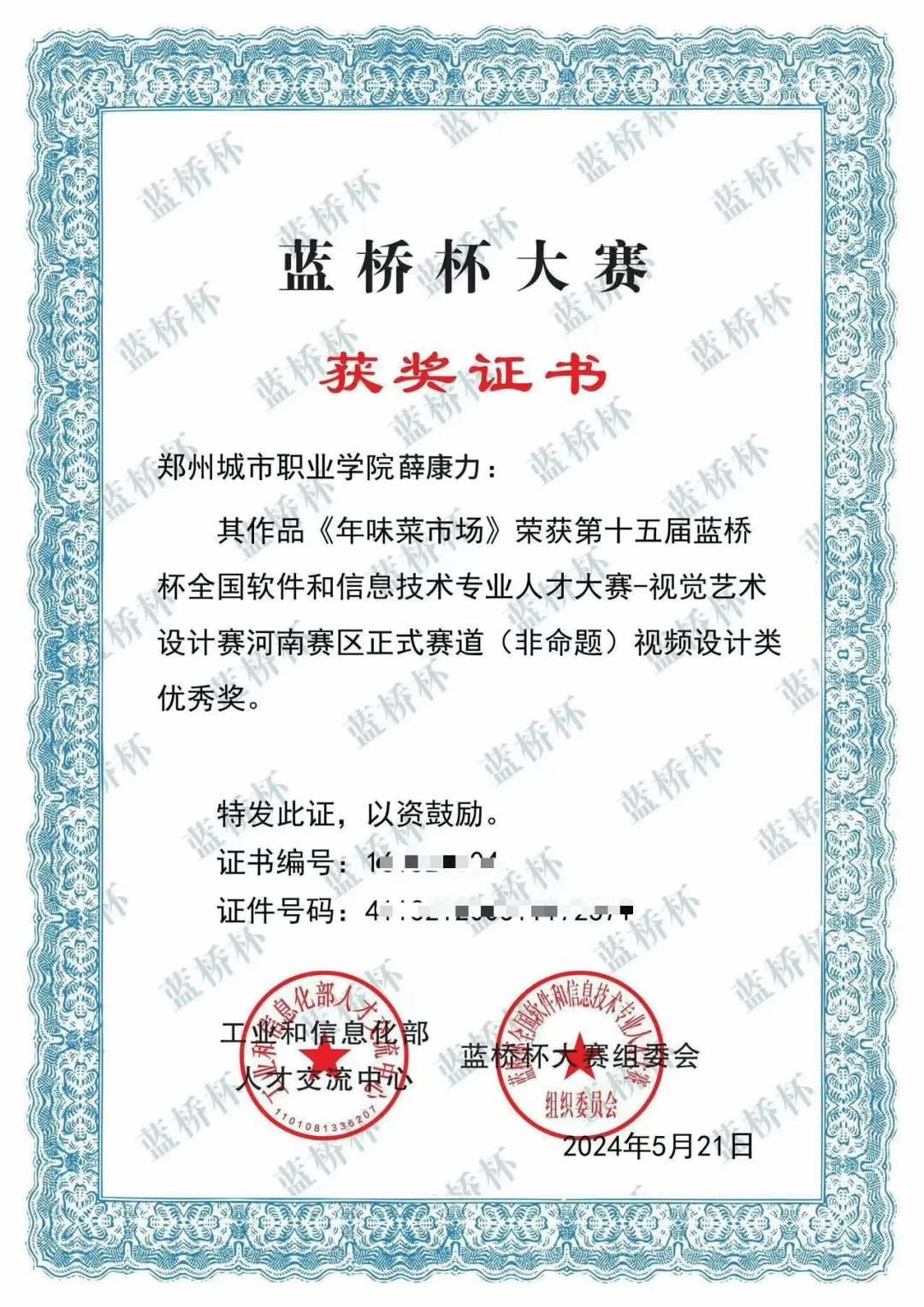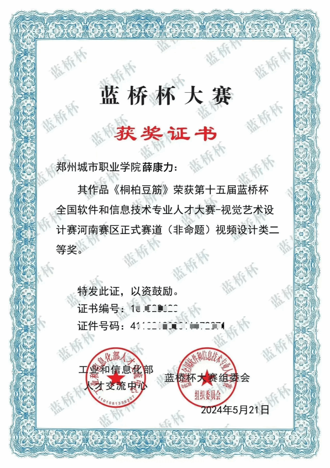 他曾在第十五届蓝桥杯全国软件和信息技术专业人才大赛中,一举斩获视频设计二等奖、交互设计(UI)三等奖及设计类优秀奖。2025年4月,在学校老师的鼓励和支持下,他报名参加全国大学生职业规划大赛,凭借清晰的职业规划与坚定的传承信念,一路层层突围挺进国赛,摘得国家级铜奖。