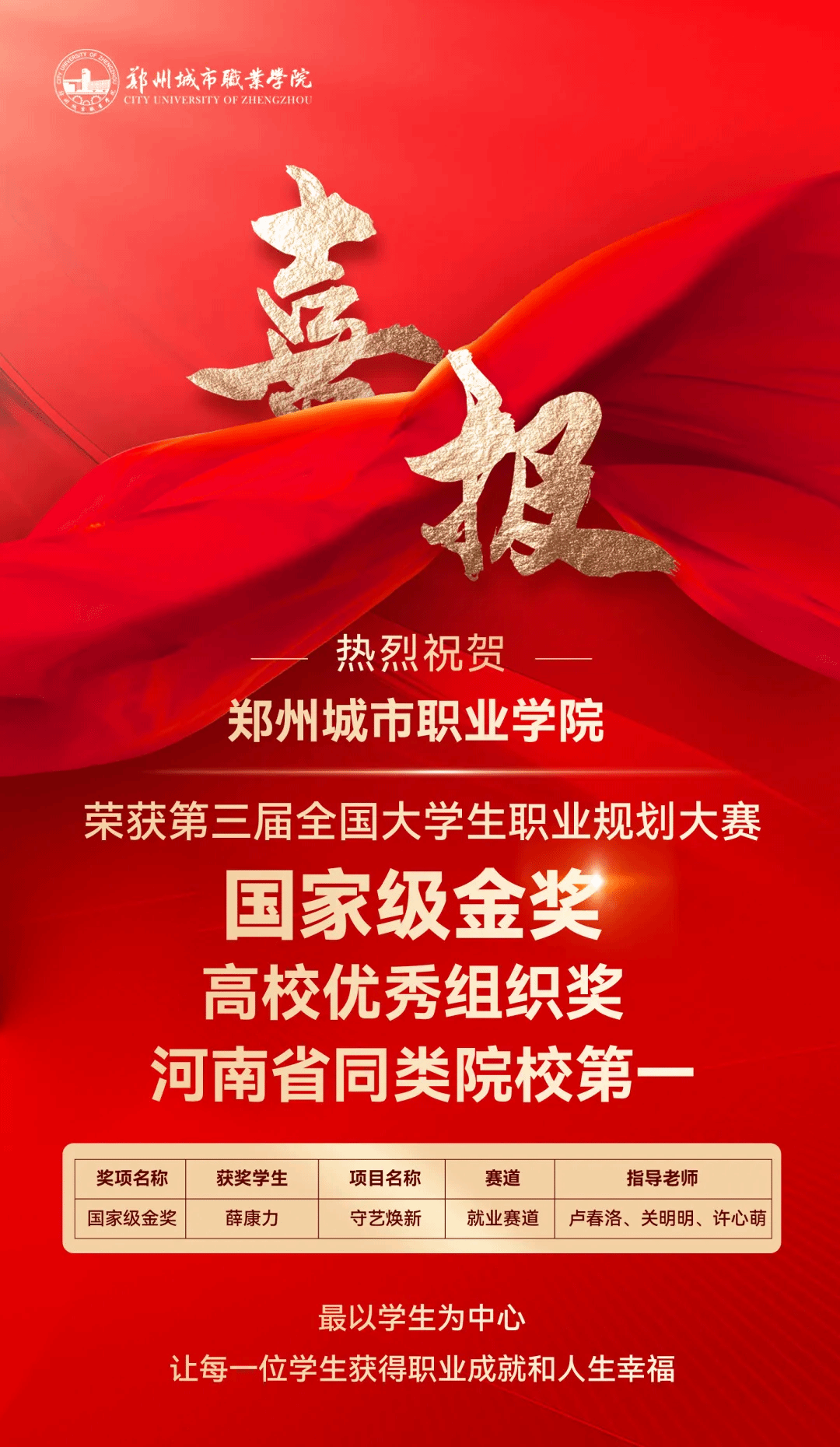 未来,郑州城市职业学院将继续以各类赛事为牵引,深化就业育人模式创新,强化专业内涵建设,助力每一位学生明确职业方向、提升就业能力、实现人生价值,为国家培养更多高技能人才,为文化传承与地方发展贡献更多力量。