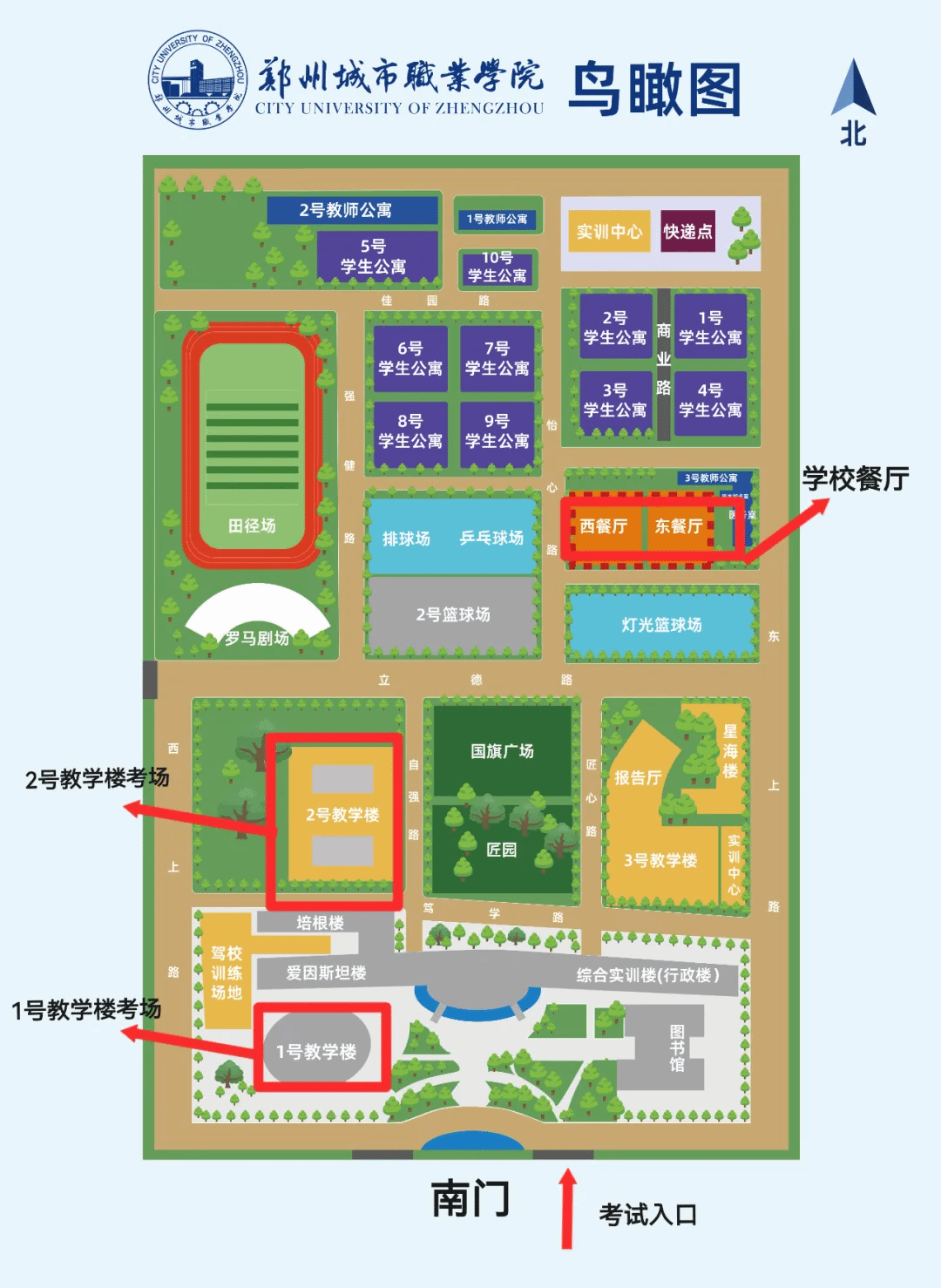 为避免考试当天因环境不熟悉而带来的困扰,学校将校园路线、考场布局、卫生间及餐厅位置等信息在显眼位置予以公布。同时,学校还特别安排了热心的校园志愿者全程为您提供指引服务,确保您能够轻松找到所需地点。(以下是详细的校园路线及考场安排图示,供您参考)