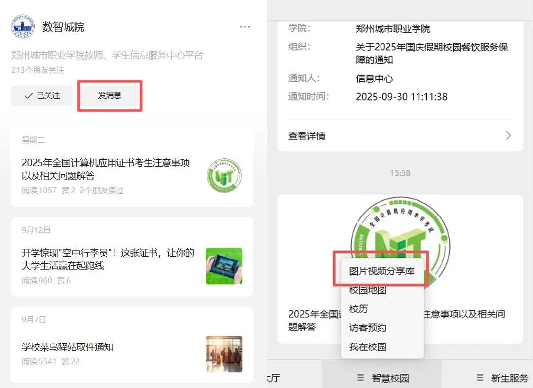 搜索【数智城院】微信公众号,进入页面,选择智慧校园-图片视频分享库,选择拍摄作品所属分类,点击上传、登录微信、提交参赛作品(电脑操作时也可以先登录再上传)。