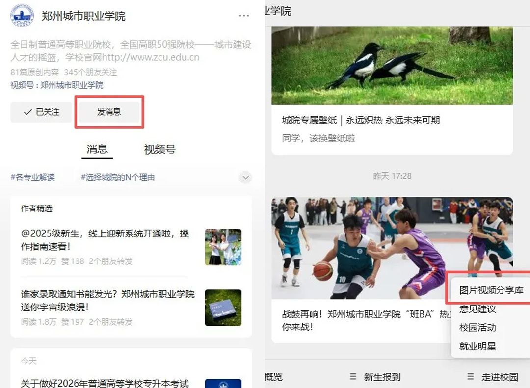 微信搜索【郑州城市职业学院】微信公众号,进入页面,选择走进校园-图片视频分享库,选择拍摄作品所属分类,点击上传、登录微信、提交参赛作品(电脑操作时也可以先登录再上传)。