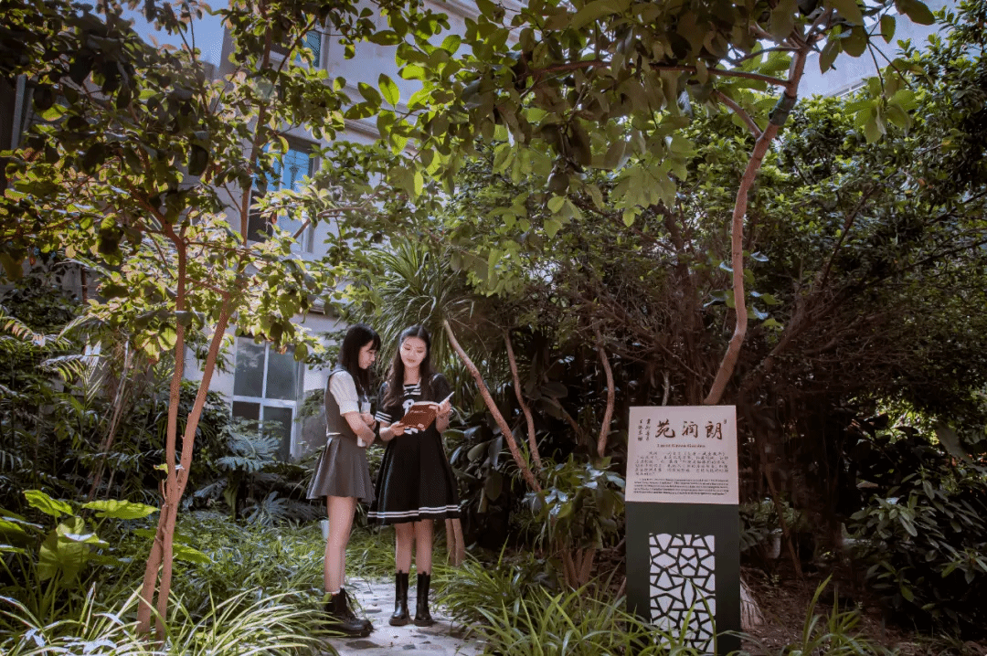 图书馆的宝藏打卡地“朗润苑”,花香阵阵、水流澹澹,阳光洒在身上带来热带雨林般休憩感受。